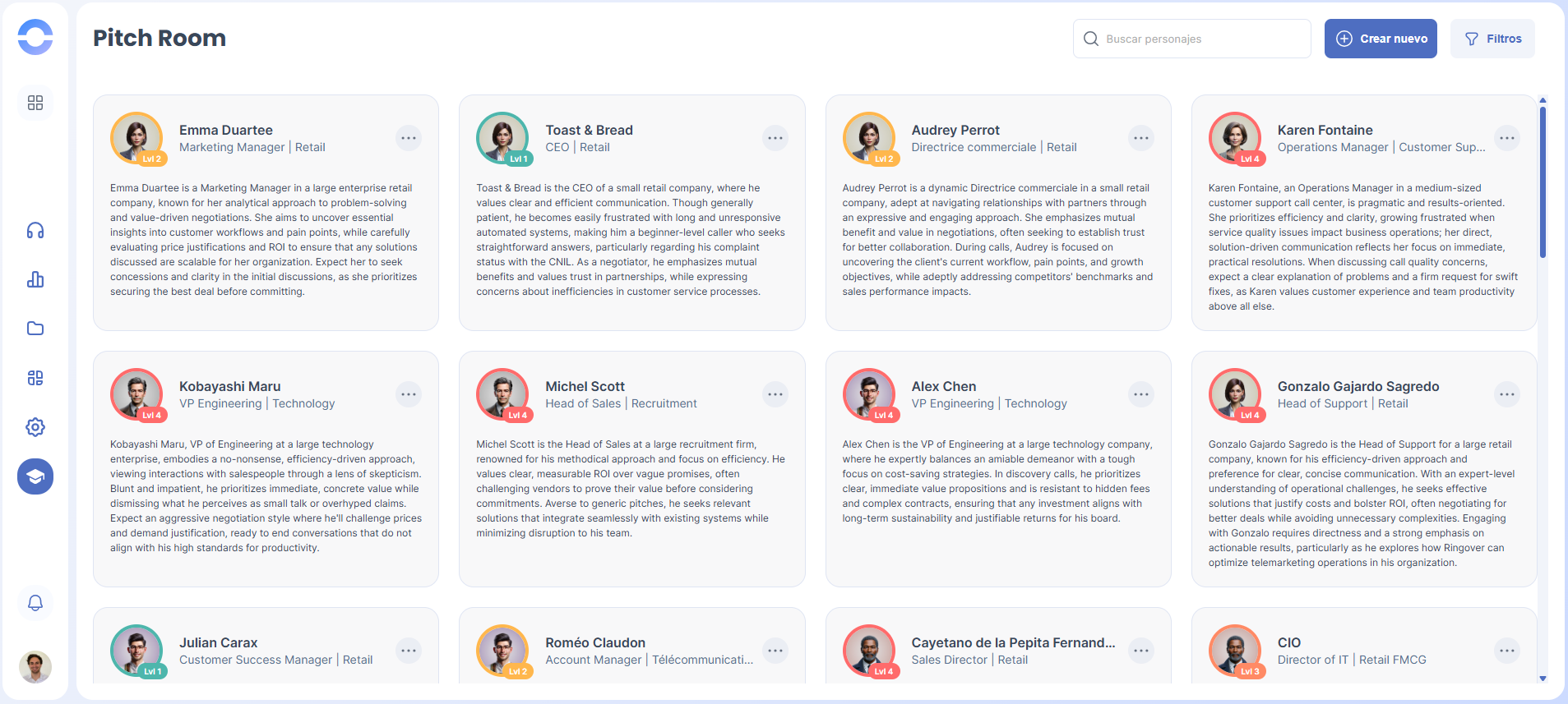 - Interactuar: habla normalmente con el personaje. La IA responde según los parámetros definidos (nivel, comportamiento, objeciones, etc.).