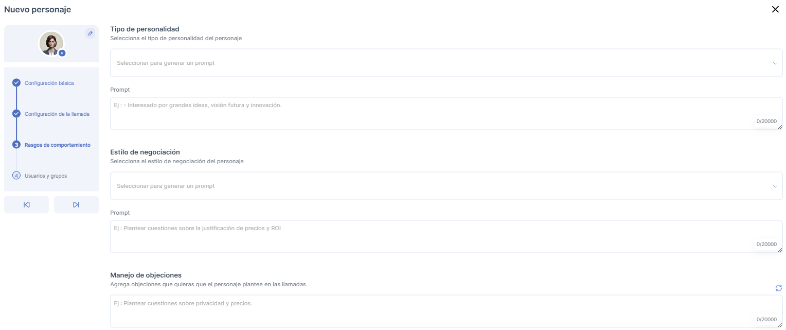 Selecciona los rasgos del personaje (comportamiento, estilo de comunicación, etc.) tal como aparecen. Estos ajustes influyen en cómo reacciona el personaje durante la llamada de entrenamiento.