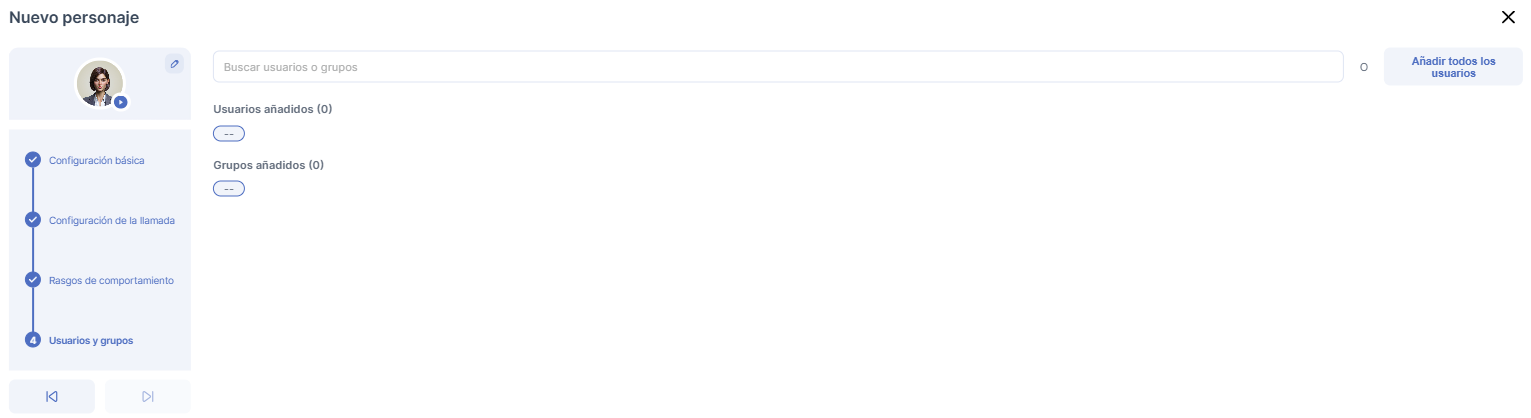 La asignación se realiza desde la etapa Usuarios y grupos durante la creación (ver arriba), o reabriendo un personaje existente y accediendo a la misma sección si el botón o pestaña está disponible.