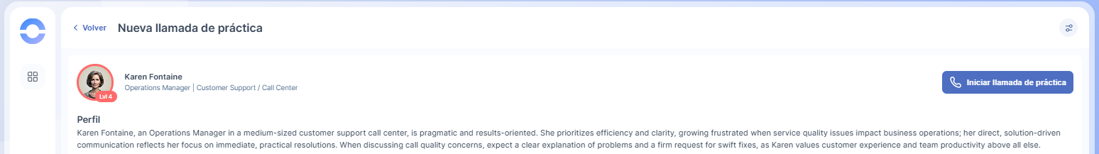 - Iniciar una llamada: haz clic en el botón de acción mostrado en la ficha para comenzar la llamada de entrenamiento.