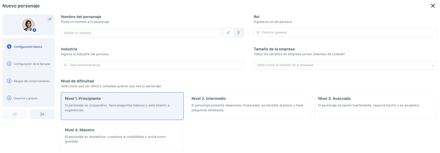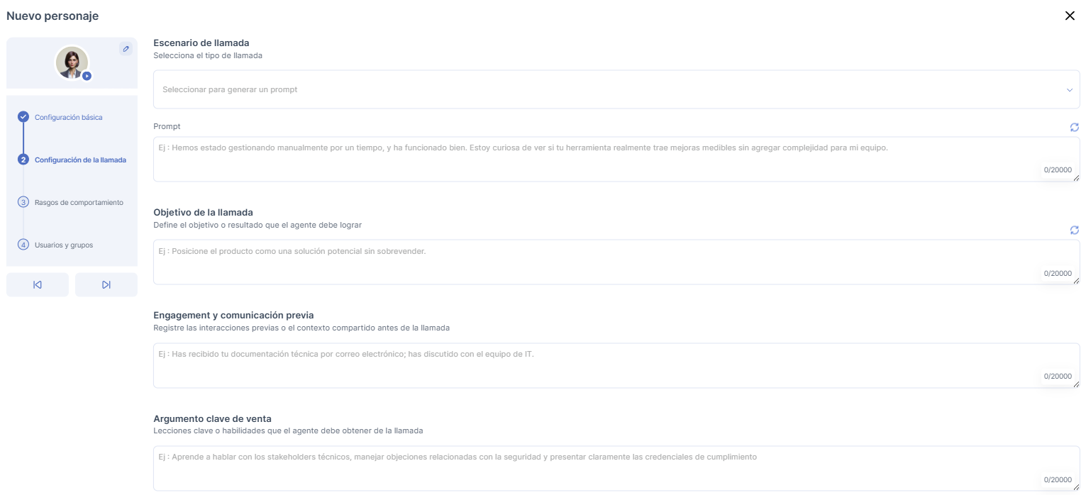 Haz clic en el botón para crear un personaje (visible en las capturas como el flujo «Nuevo personaje»). Llegarás a una pantalla de configuración con varias secciones visibles en la barra lateral (por ejemplo: Configuración básica, Configuración de la llamada, que puede aparecer como «Configuración de recordatorio» según la captura, Rasgos de comportamiento, Usuarios y grupos).