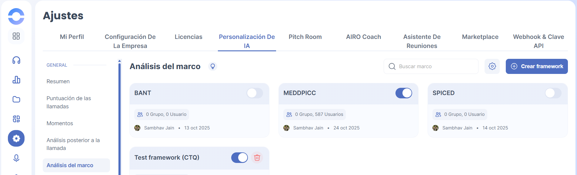 - Seleccionar un framework predeterminado (ej. MEDDPICC) para todos los usuarios.
