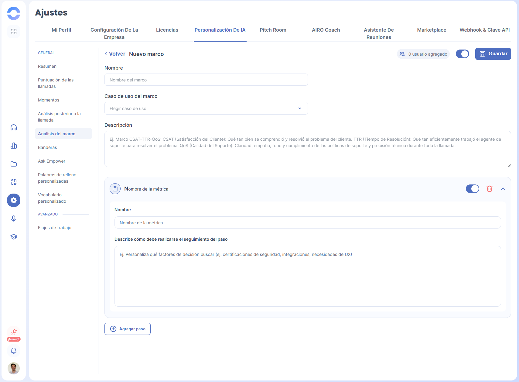 - Descripción: especifique el objetivo del marco y los puntos de evaluación (ej. «Analizar la claridad, empatía y precisión en las respuestas»).