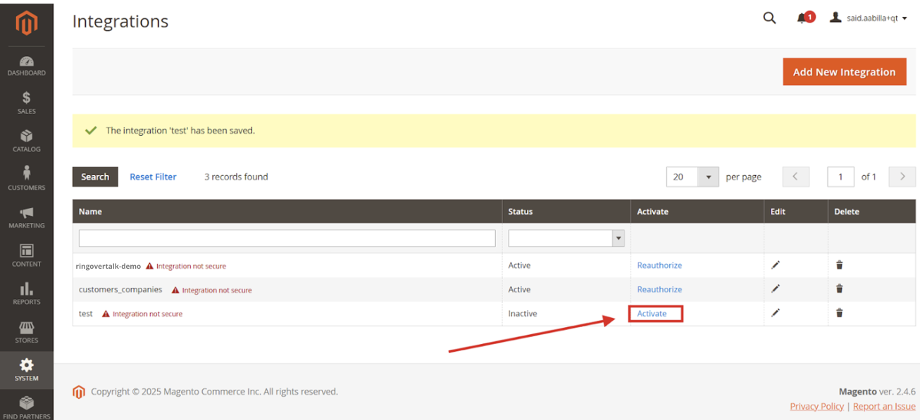 - Desde tu panel de control de Magento, ve a Integrations :