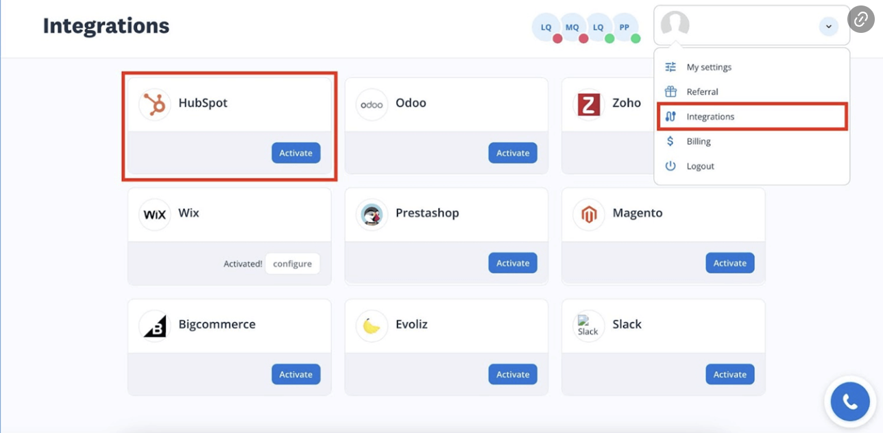 - Ve a la sección de Integración en tu cuenta de Ringover Talk y haz clic en Activar en Hubspot.