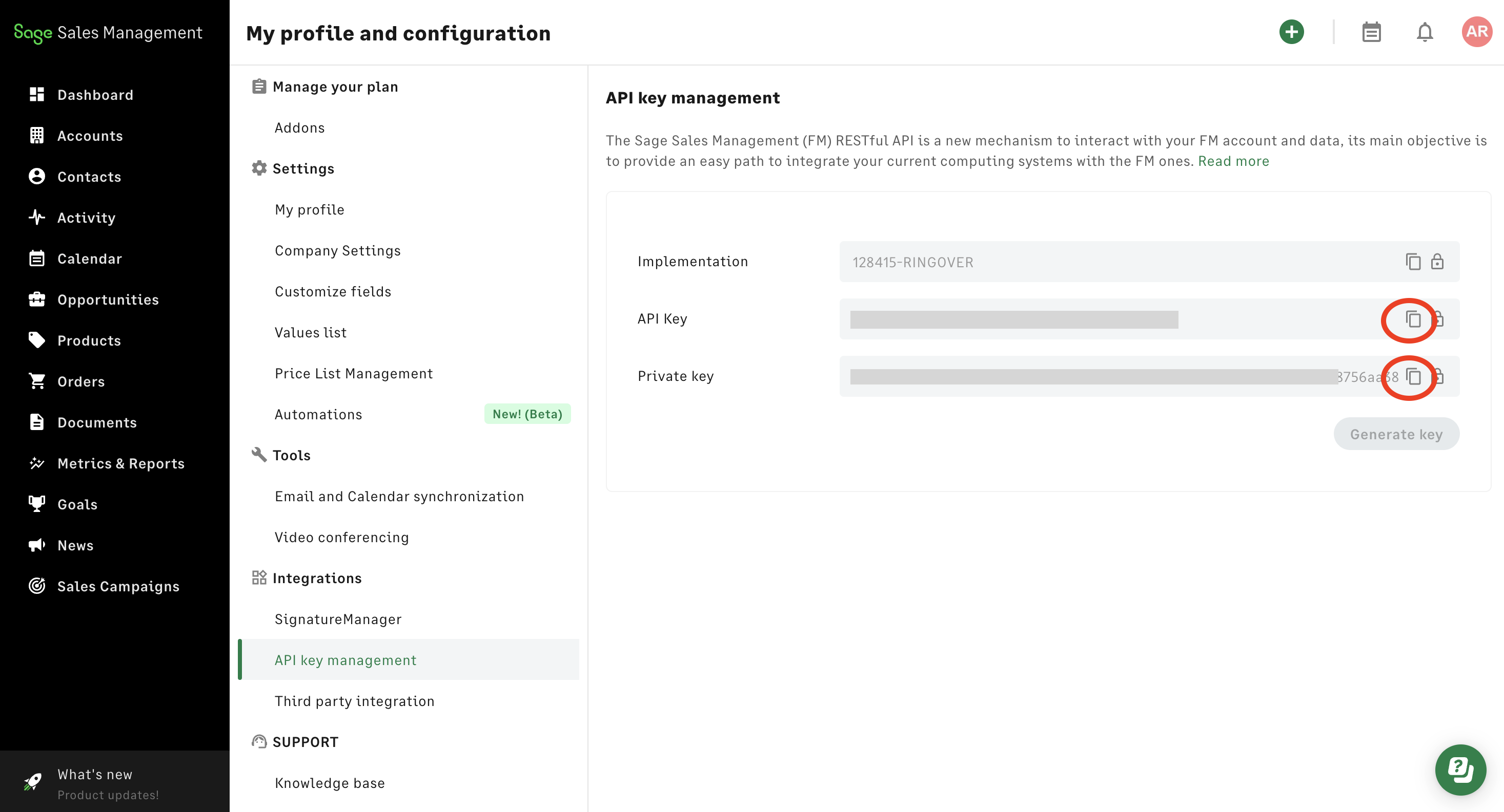 Para activar la integración, necesitas una Public key y una Private key generadas desde tu cuenta de Sage.