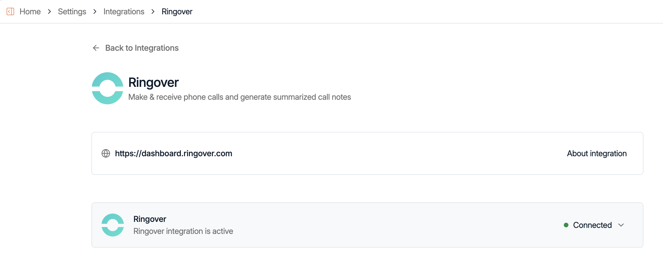 - En Spott, abre la página de integración de Ringover y haz clic en
