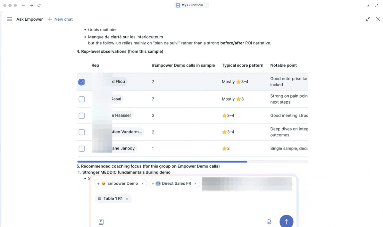 | Compara el guion de demo del mejor agente con el resto del equipo: muestra 3 diferencias clave | Identificación de mejores prácticas a escala |