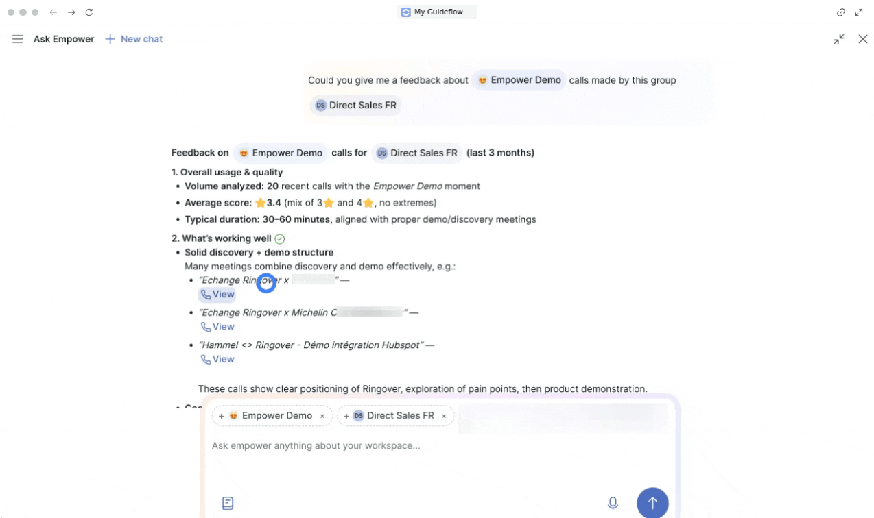Para obtener respuestas más precisas y relevantes, use “@” para etiquetar entidades específicas: agentes, contactos, cuentas, llamadas, grupos, flags, etiquetas, momentos