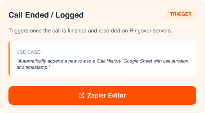 La integración de Ringover con Zapier te permite automatizar tus flujos de trabajo conectando tu sistema de telefonía con más de 8.000 aplicaciones (CRM, herramientas de soporte, aplicaciones de mensajería de equipo). Aunque tu herramienta no aparezca directamente en el panel de Ringover, puedes añadirla mediante Zapier.