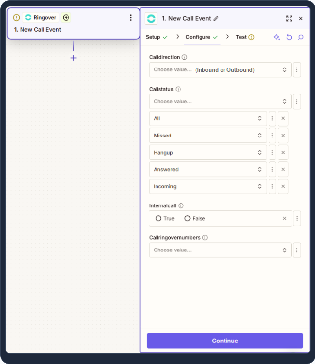 El desencadenador es el evento en Ringover que iniciará la acción (p. ej., "Cuando finaliza una llamada...").