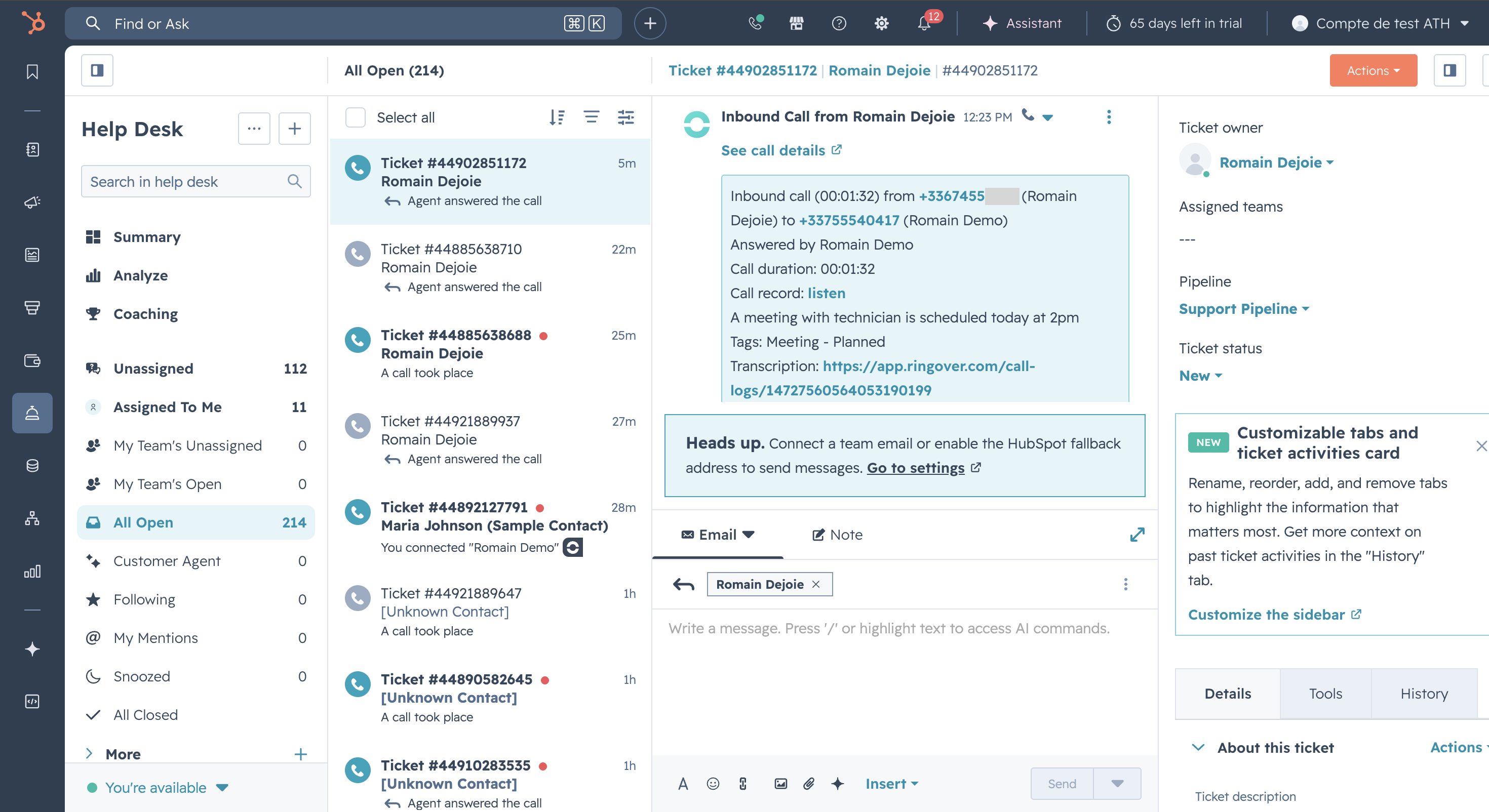 Conectar Ringover como proveedor de llamadas en HubSpot Help Desk te permite recibir y gestionar llamadas dentro de tu proceso de tickets.