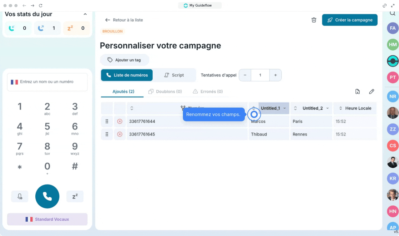 Vous pouvez lancer une campagne d'appel avec le Power Dialer. Après importation, vous allez personnaliser votre campagne, vous pouvez :