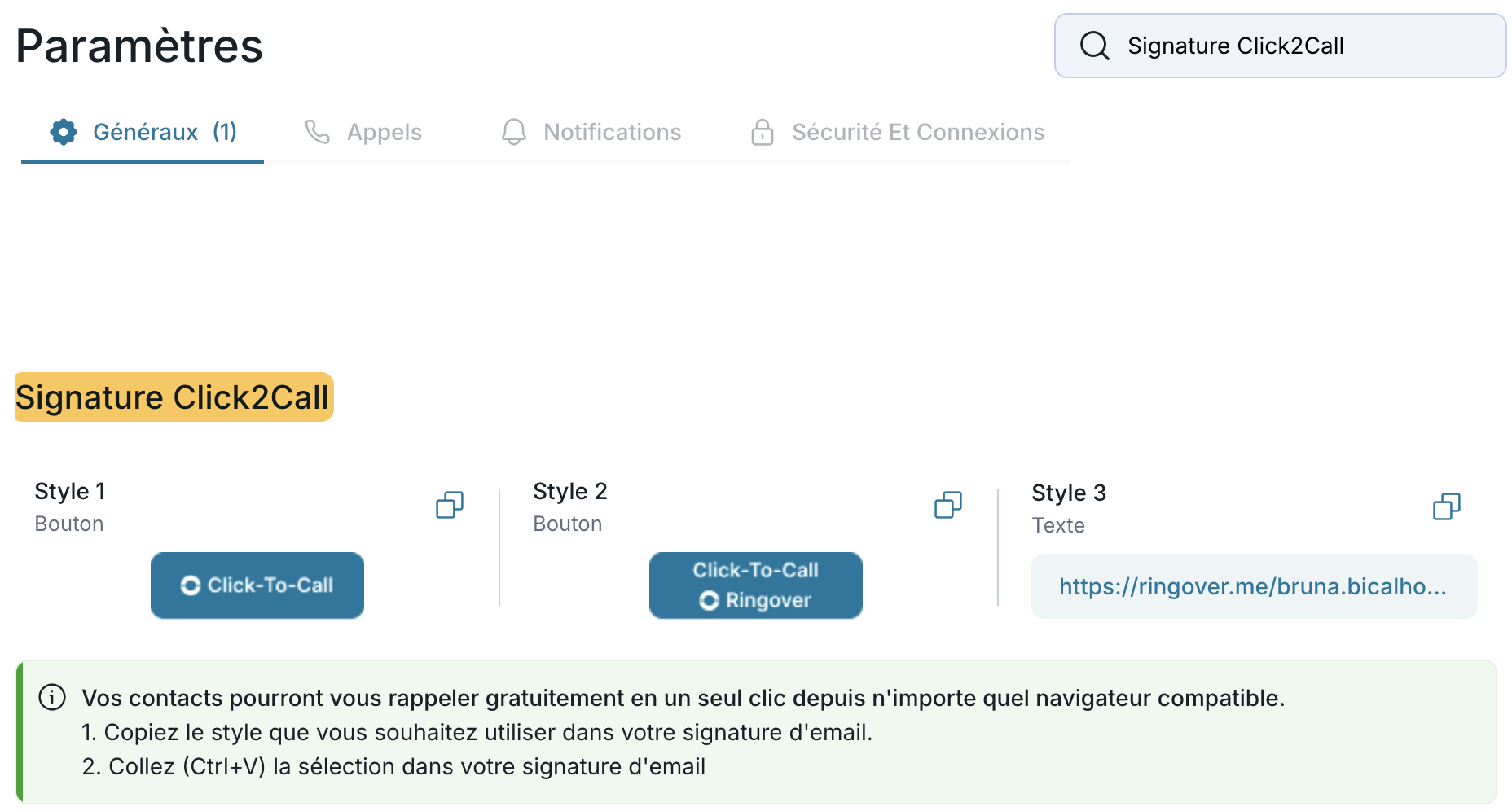 Recherchez les paramètres > Généraux, puis la section "Signature Click-to-Call".