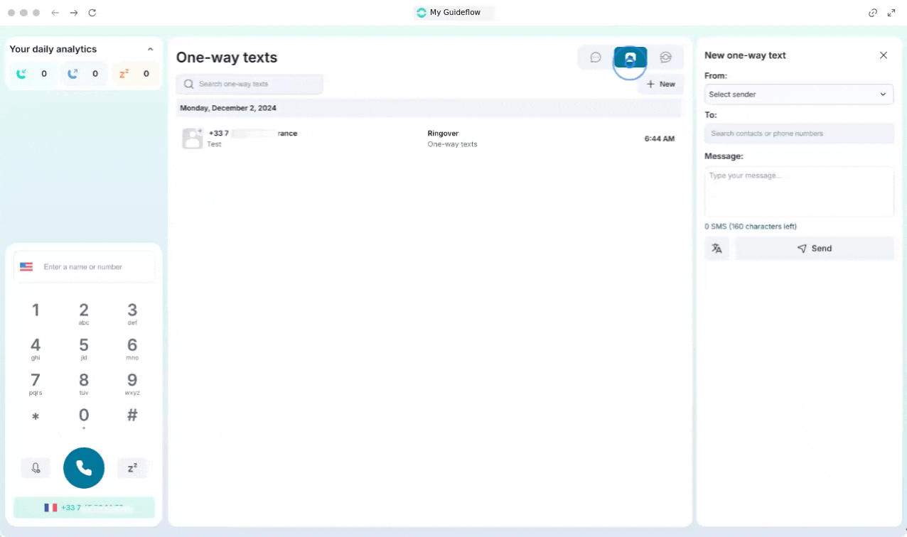 Les outils de messagerie de Ringover vous permettent de communiquer efficacement avec vos clients par SMS et de collaborer en toute fluidité avec votre équipe. Dans ce guide, vous apprendrez comment envoyer, programmer et gérer vos messages directement depuis votre compte.