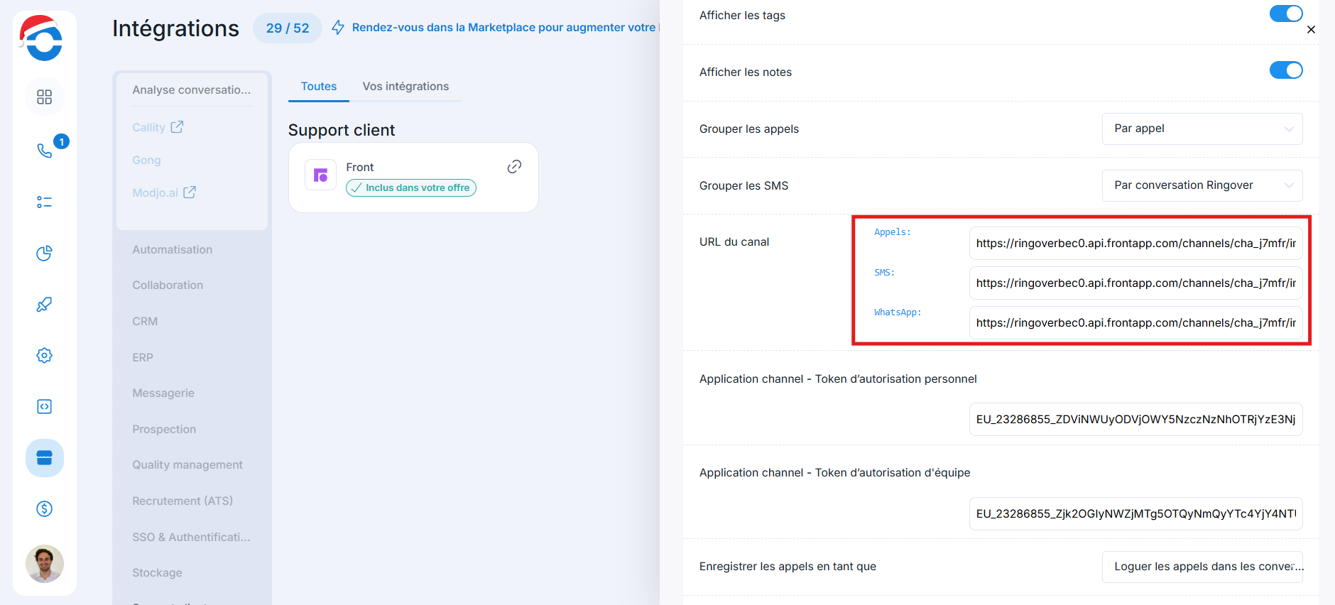 Désormais, les appels Ringover, les messages SMS et les messages WhatsApp seront enregistrés dans Front