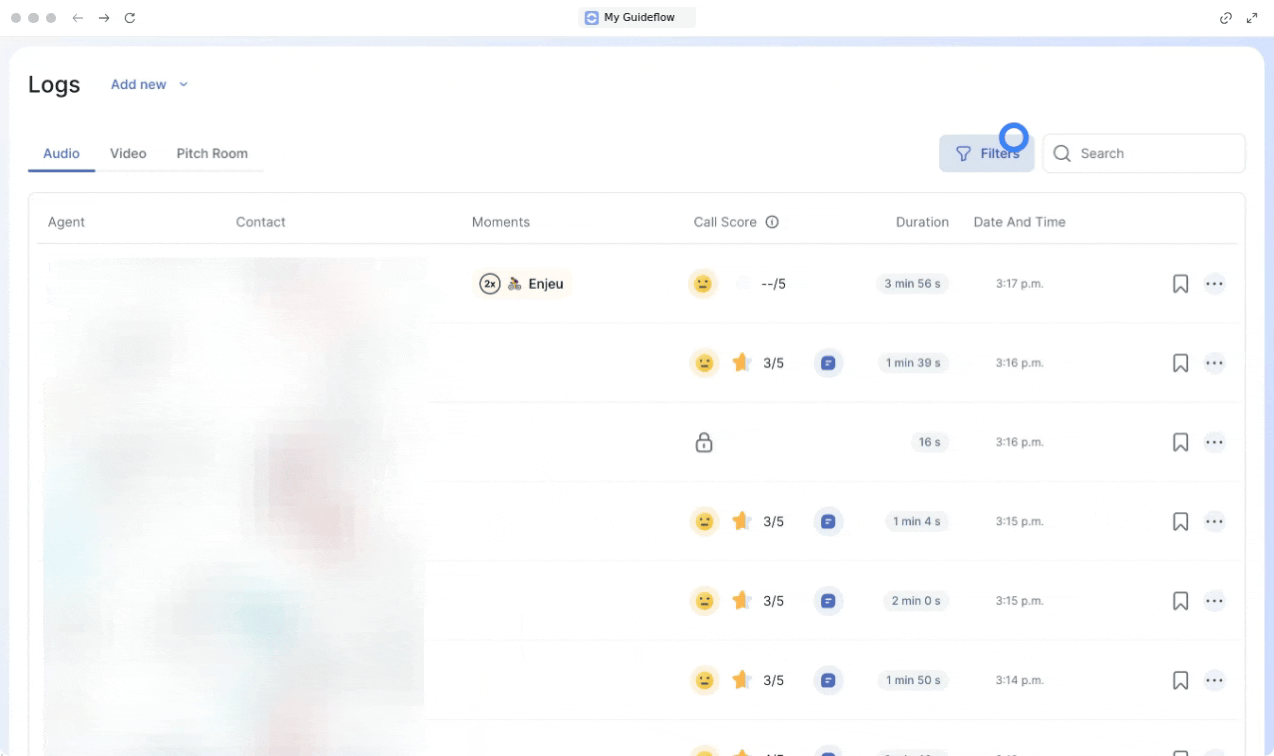 Empower vous permet de filtrer vos journaux en fonction des enregistrements audio, sessions vidéo et interactions Pitch Room. Ces filtres vous aident à localiser des contenus spécifiques, évaluer les performances et optimiser votre flux de travail.