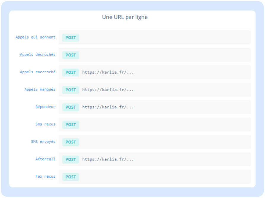 Renseignez les URL fournies dans Karlia aux emplacements définis sur Ringover. Utilisez l'URL correspondante pour chaque Webhook : une URL pour les événements d'appels (appels raccrochés, manqués, répondeur et Aftercall) et une autre pour la recherche et l'appel de contacts.