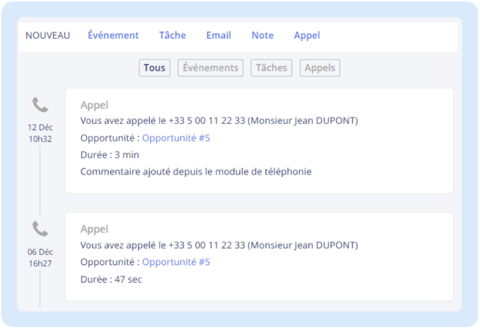 - Les appels sont automatiquement liés à la fiche client si le numéro est trouvé dans le répertoire.