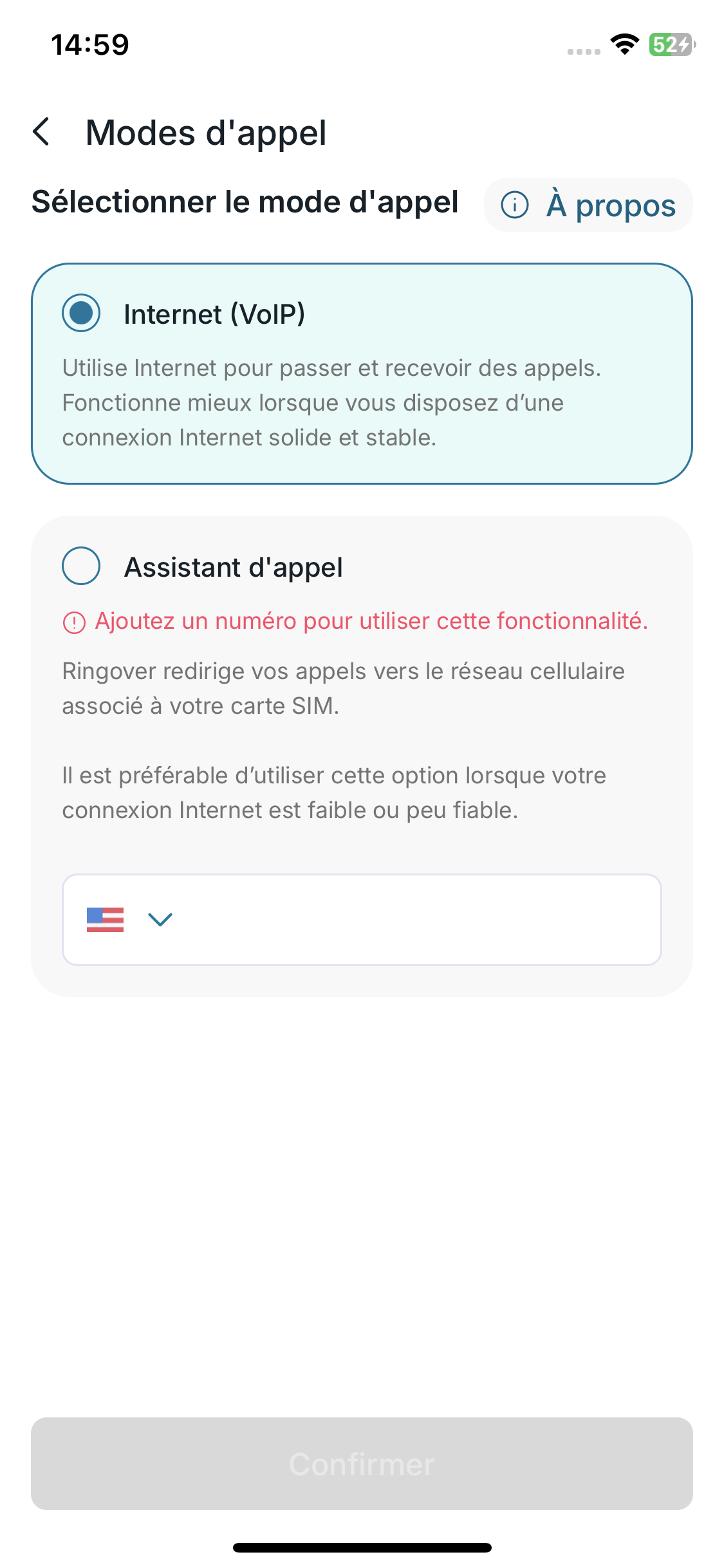 Grâce à l’option “VoIP”, vous passez et recevez vos appels via Internet. Vos appels peuvent être redirigés vers votre numéro mobile. Cette fonctionnalité est particulièrement utile en cas :