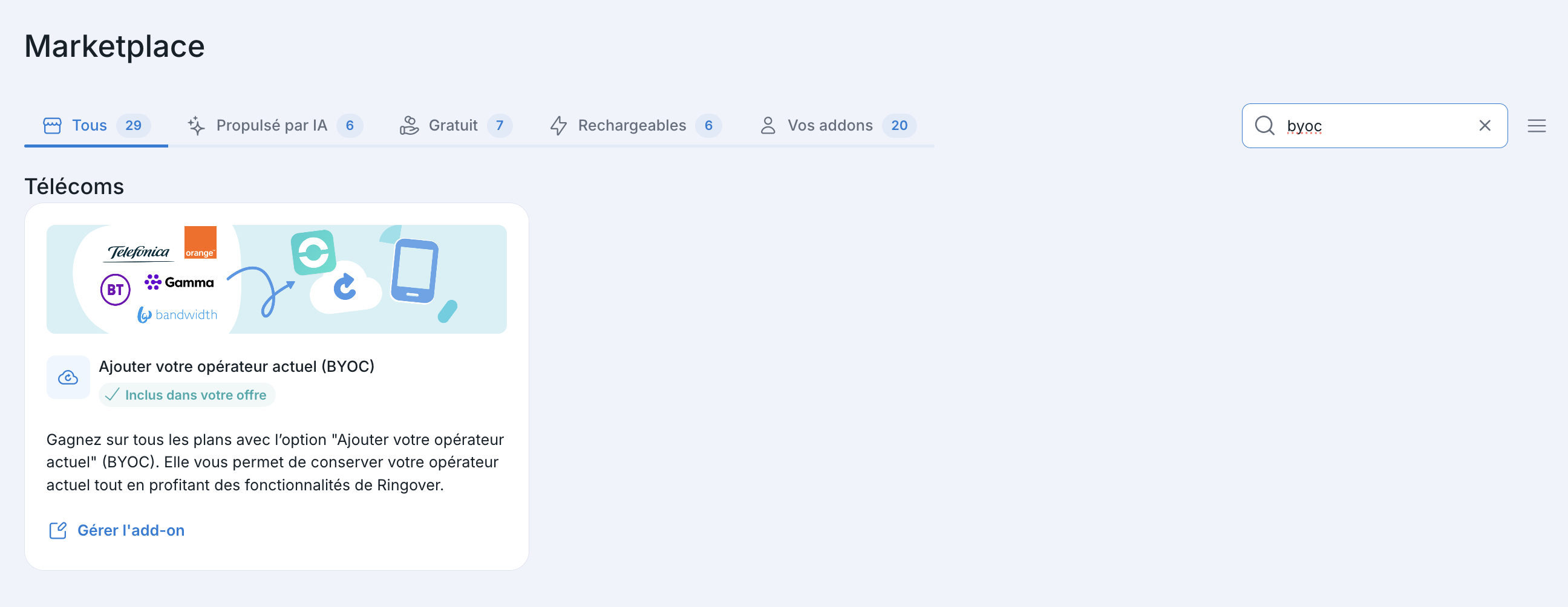 Ajouter votre opérateur actuel (Bring your own carrier - BYOC) vous permet de conserver votre opérateur téléphonique actuel et de l'utiliser avec les fonctionnalités avancées de communication cloud de Ringover.