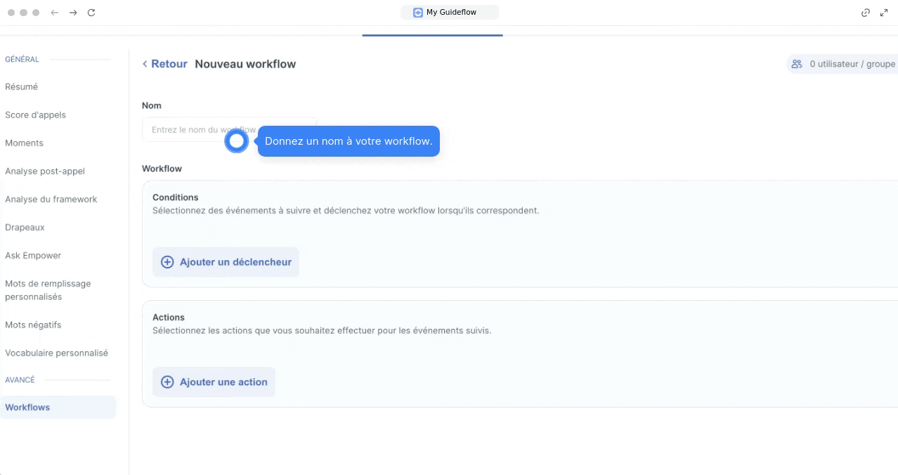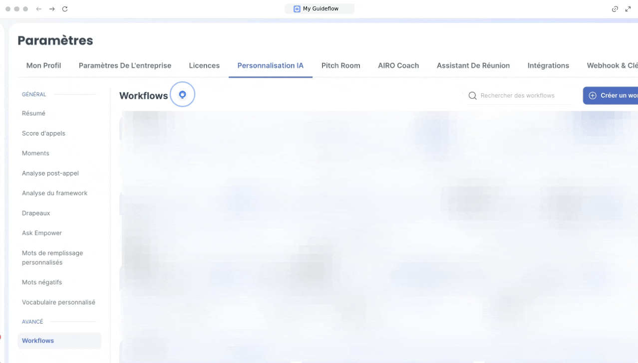 Pour créer votre workflow, rendez-vous dans la section Workflows de Personnalisation IA dans votre espace Empower et cliquez sur « Créer un workflow ».