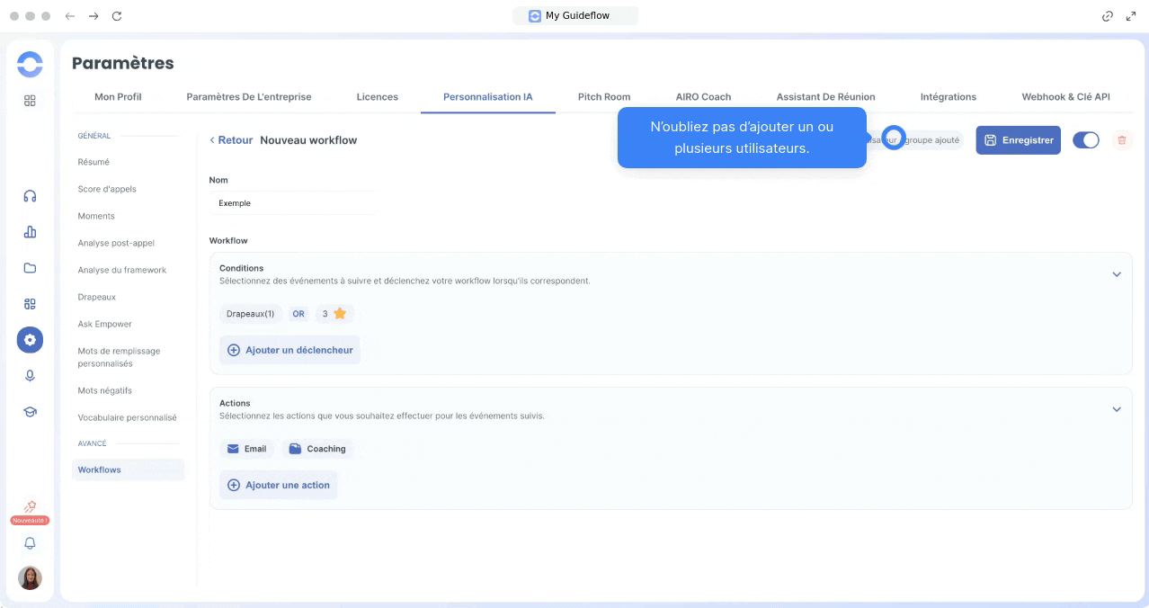 Pour terminer, ajoutez les utilisateurs et/ou groupes, enregistrez votre workflow et activez-le.
