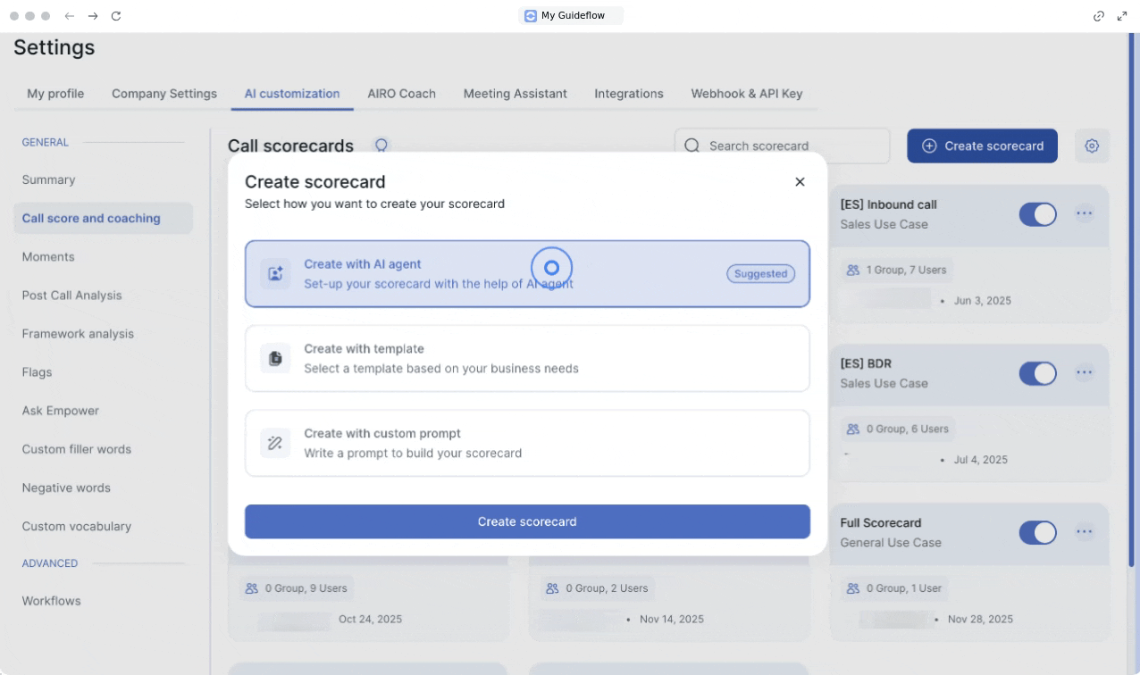 Depuis les paramètres Empower, accédez à la section Personnalisation de l'IA. Cliquez sur Grilles d'évaluation et coaching, puis sélectionnez créer une grille d'évaluation. Trois options de création sont disponibles.