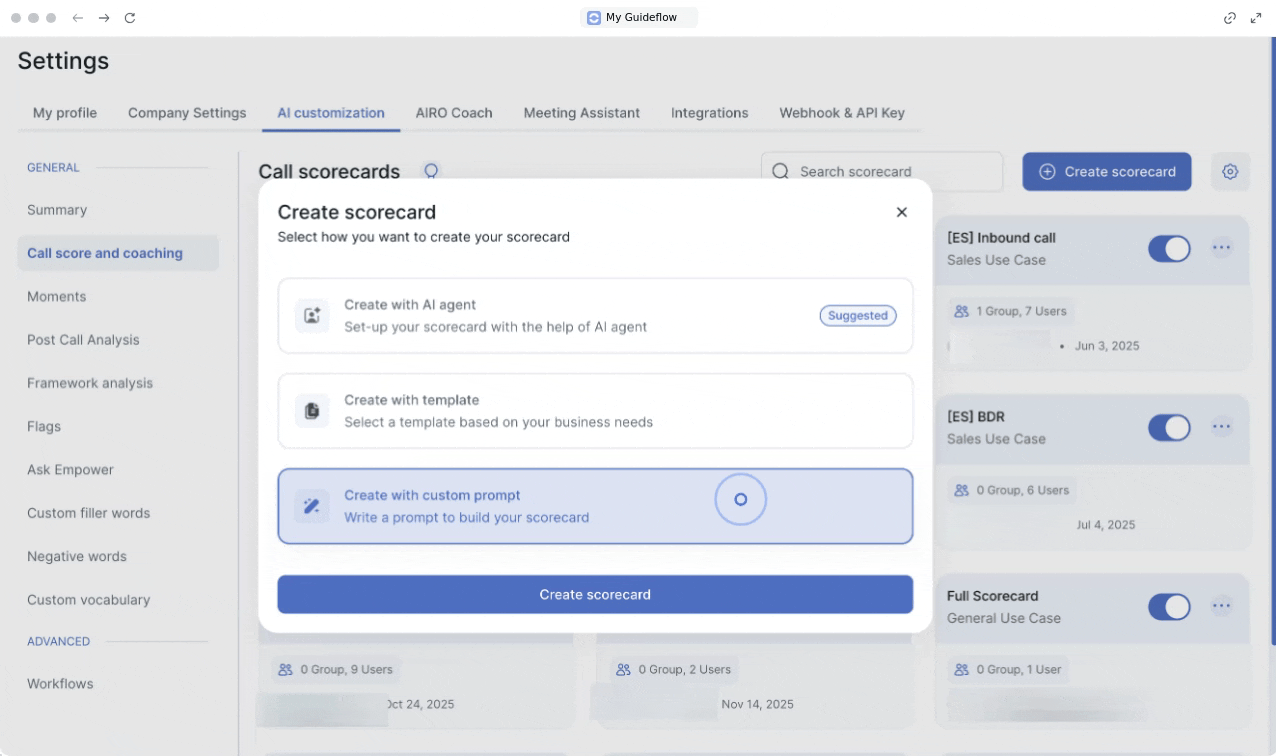 C'est l'option la plus flexible. Vous nommez votre formulaire, choisissez le cas d'usage et rédigez les instructions. Il est recommandé d'inclure le rôle que l'IA doit adopter, la méthodologie de notation et les étapes clés de l'appel.