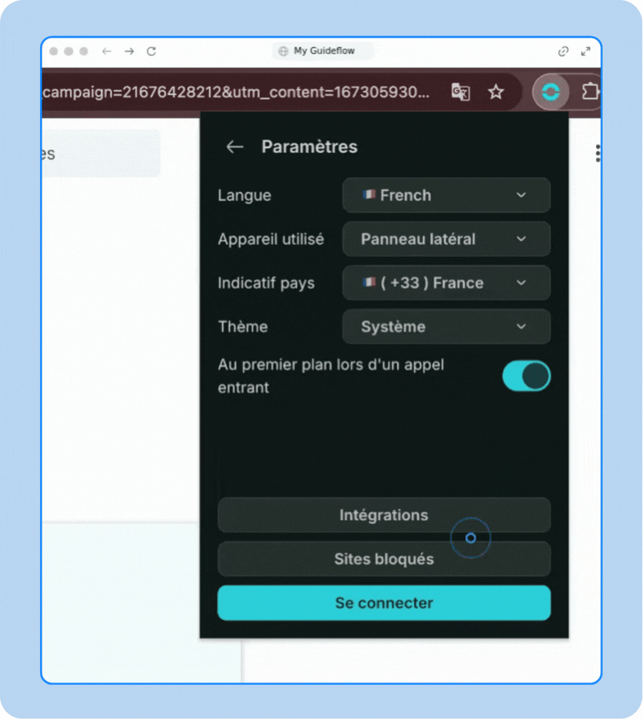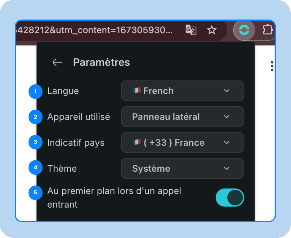 Power Dialer : permet d’activer le mode d’appel automatique directement depuis l’extension.