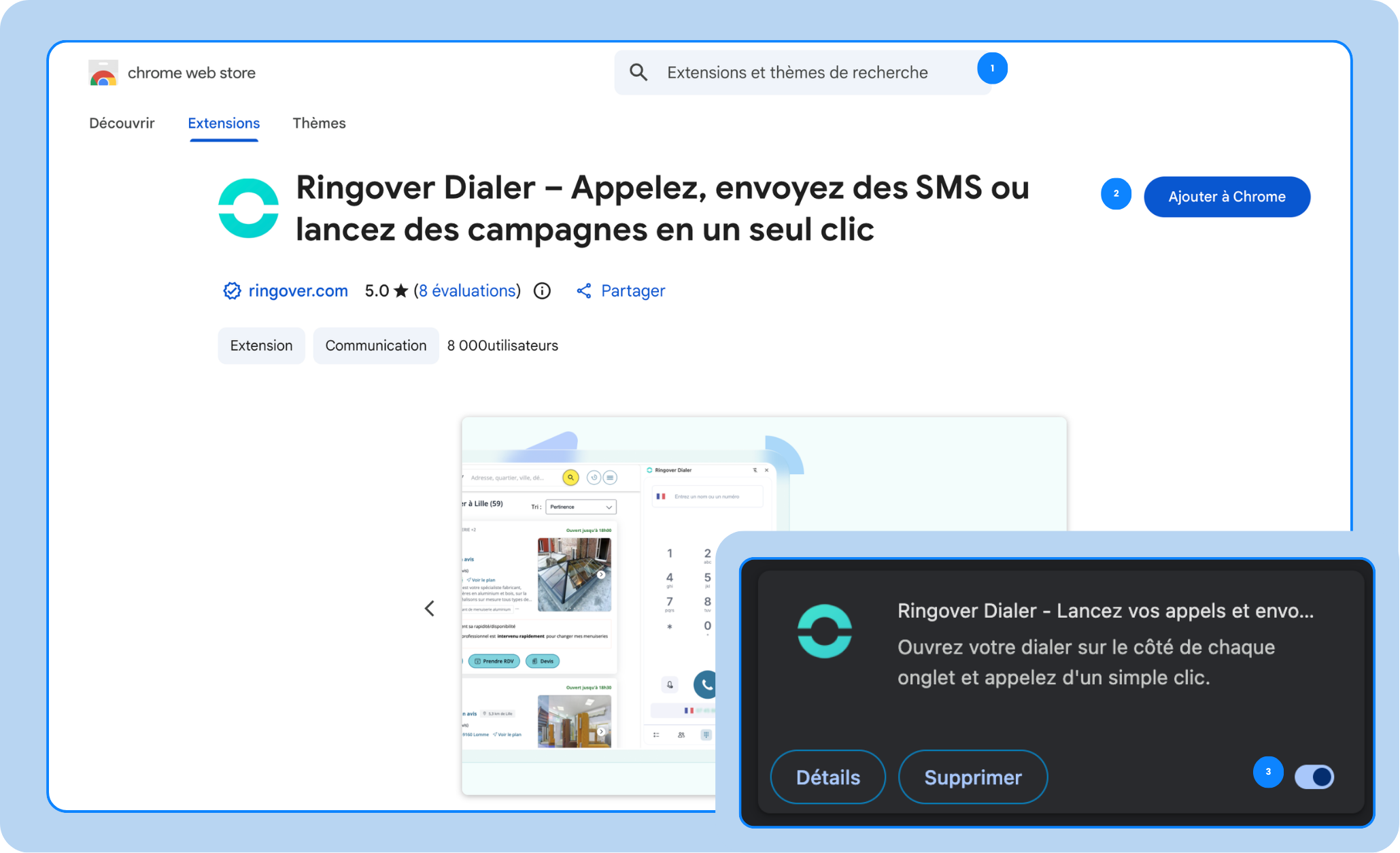 - Ouvrez le gestionnaire d’extensions de Google Chrome. Dans la barre de recherche, saisissez Ringover Dialer. Vous serez redirigé vers la page de l’extension.