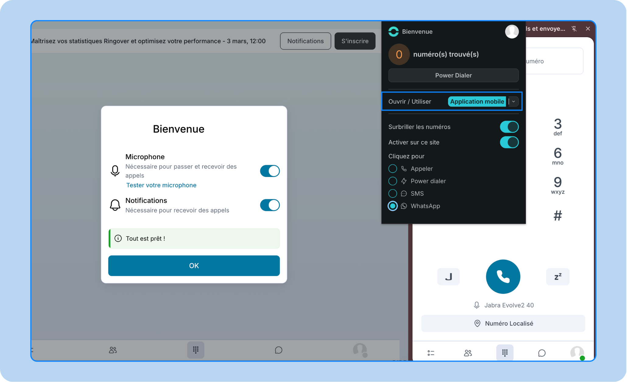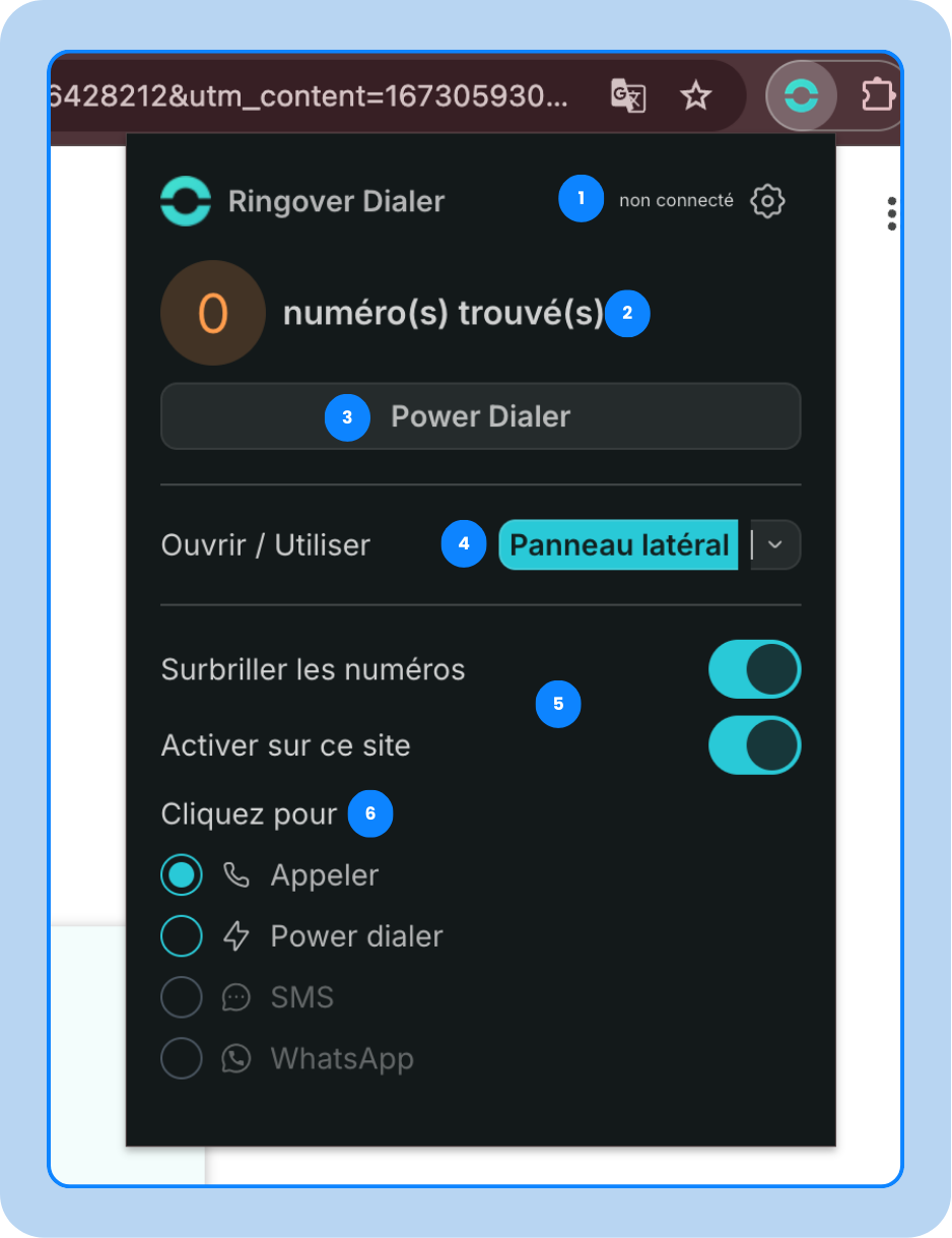 Le Ringover Dialer est une extension qui permet aux utilisateurs de passer des appels téléphoniques grâce à la fonctionnalité click-to-call, d’envoyer des SMS et de lancer des campagnes d’appels directement depuis n’importe quelle page web.