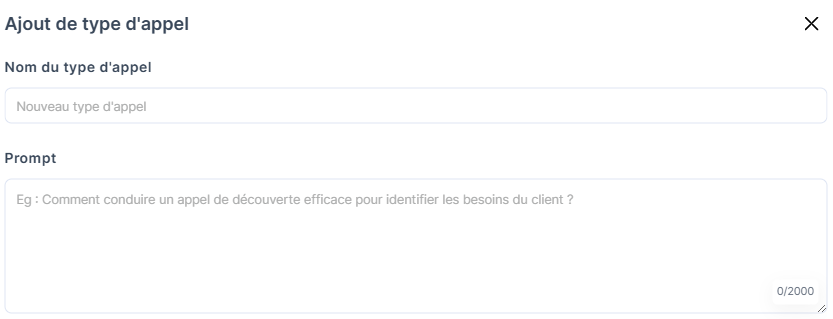- Prompt : décrivez brièvement l’objectif du type d’appel. Exemple : “Comment conduire un appel de découverte efficace pour identifier les besoins du client ?”