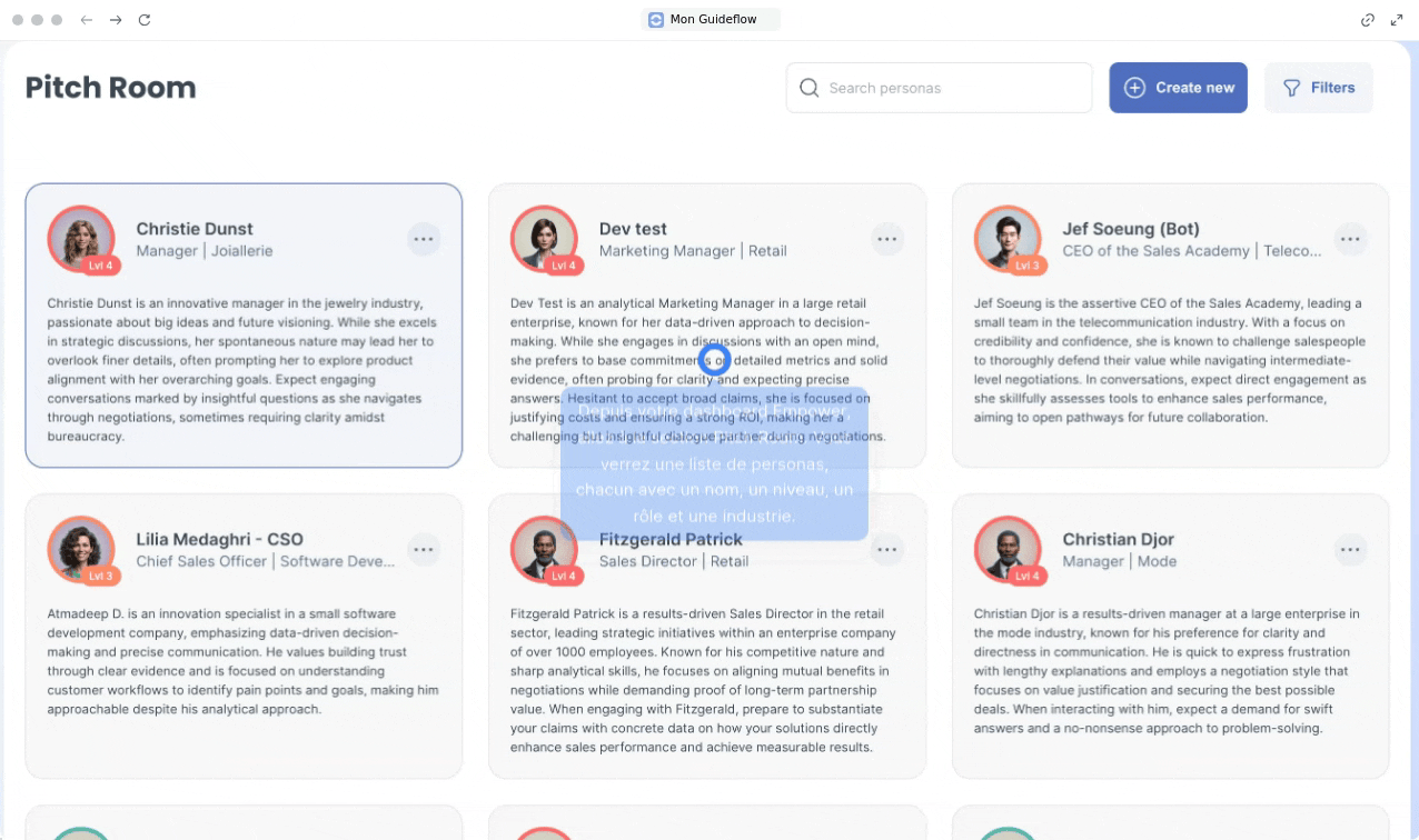 Depuis votre tableau de bord empower, cliquez sur l’icône Pitch Room. L’écran affiche une liste de personas disponibles. Chaque persona présente son nom, son niveau, son rôle et son secteur d’activité.