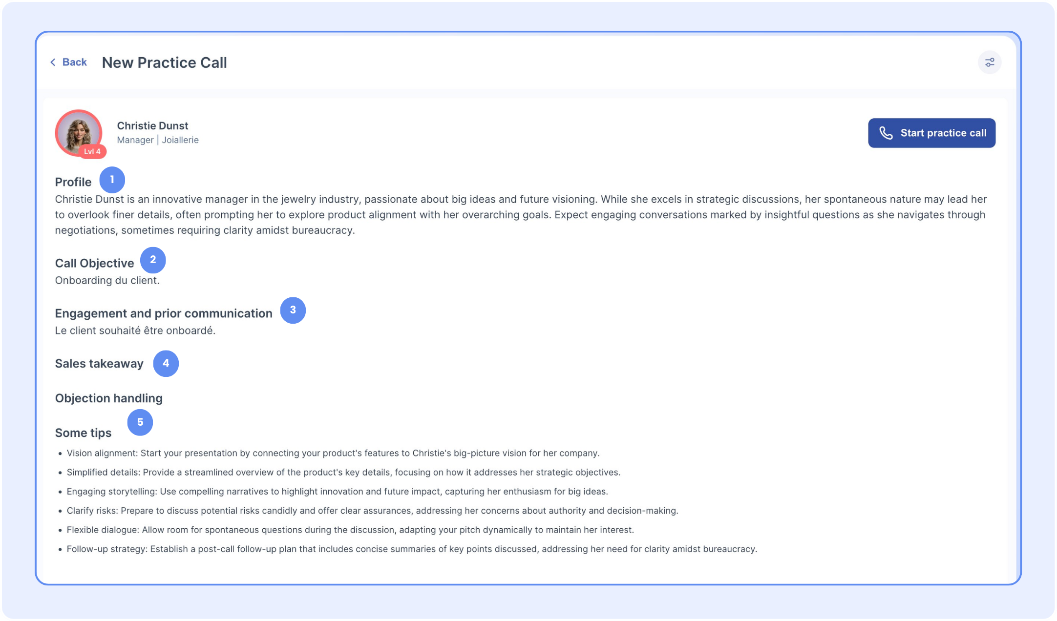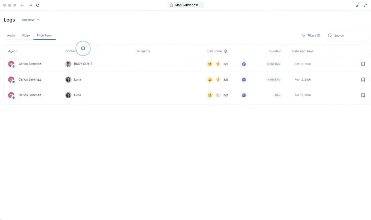 Ce guide décrit les étapes pour démarrer et finaliser une simulation d’entraînement à l’aide du Pitch Room, depuis l’accès aux personas jusqu’à l’analyse après appel.