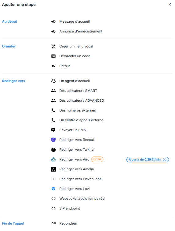 - SIP endpoint : pour connecter votre système téléphonique à une autre plateforme via SIP.