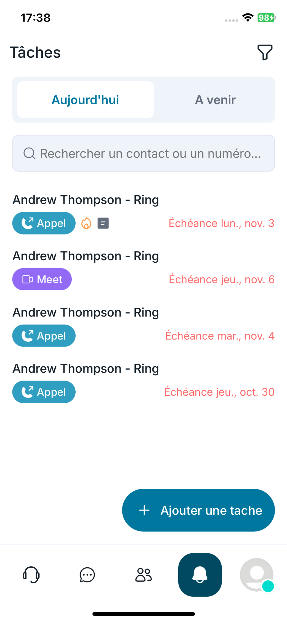 Vous pouvez lancer directement l’action (appel, SMS ou Meet) depuis votre liste de tâches.