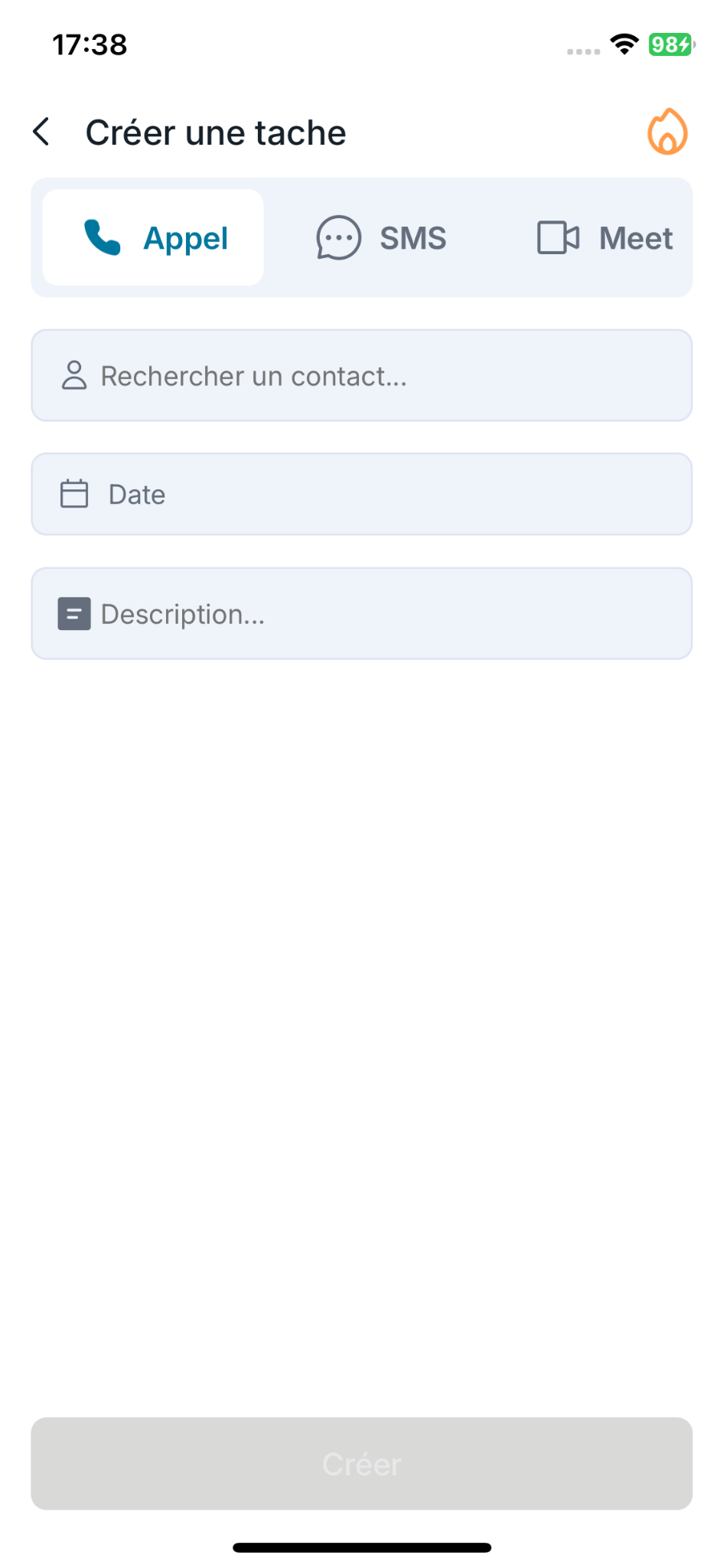 Sur l’écran de création, commencez par choisir le type de tâche : Appel, SMS ou Meet.