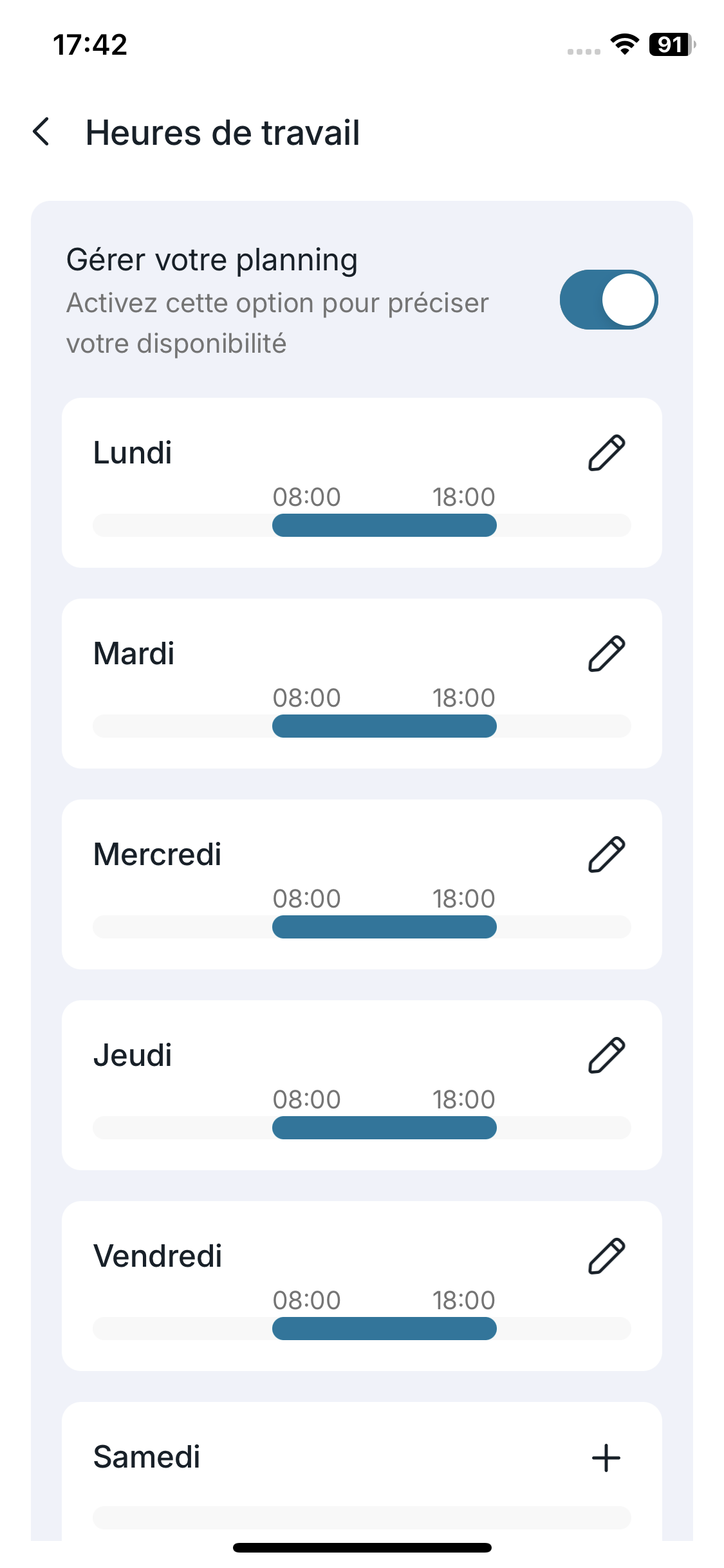 - Définissez pour chaque jour vos horaires de début et de fin.