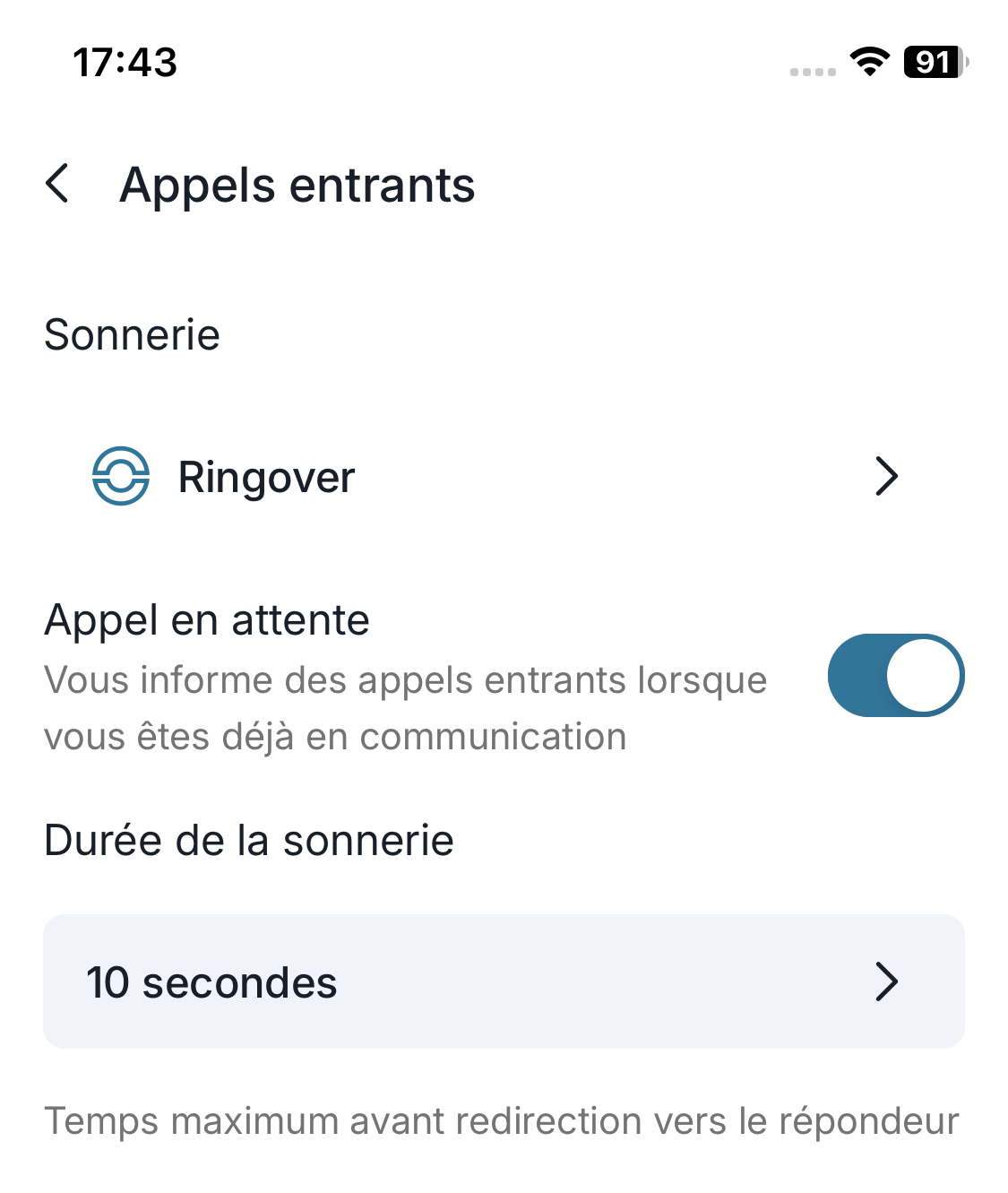 - Ajustez la durée de la sonnerie (par exemple 10 secondes) avant redirection vers la messagerie.