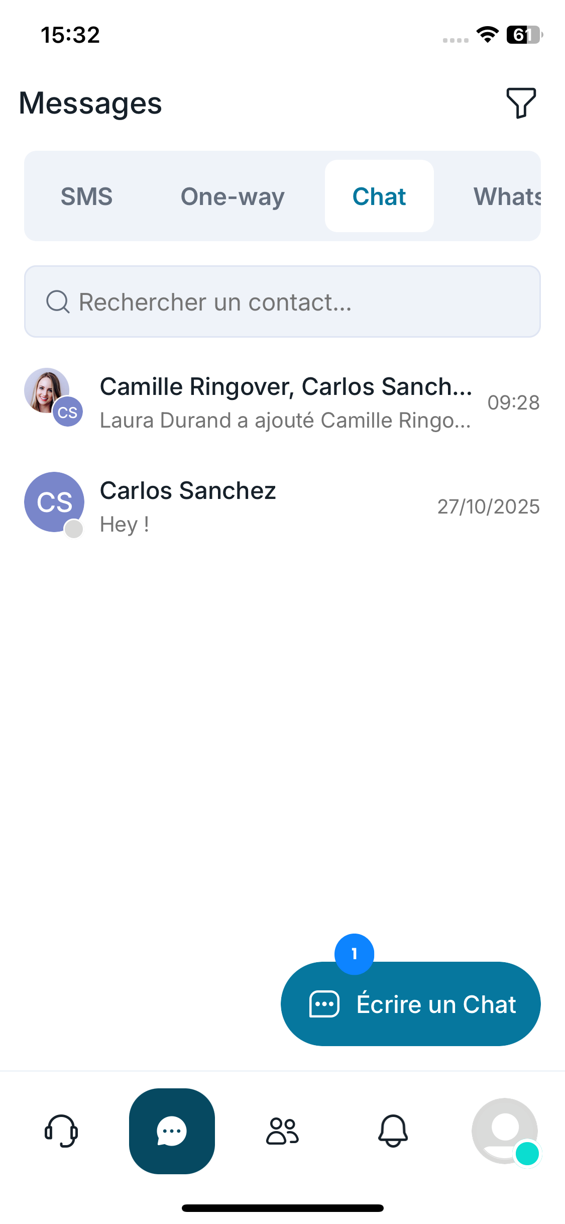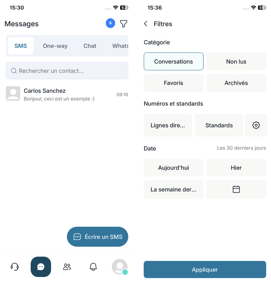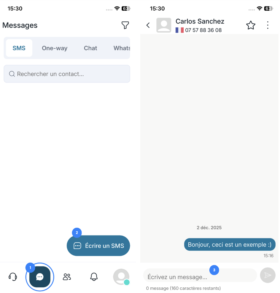 👉 Vous y trouverez tous vos canaux de communication : SMS, One-Way, Chat, WhatsApp, Messenger, Instagram et Google Reviews.