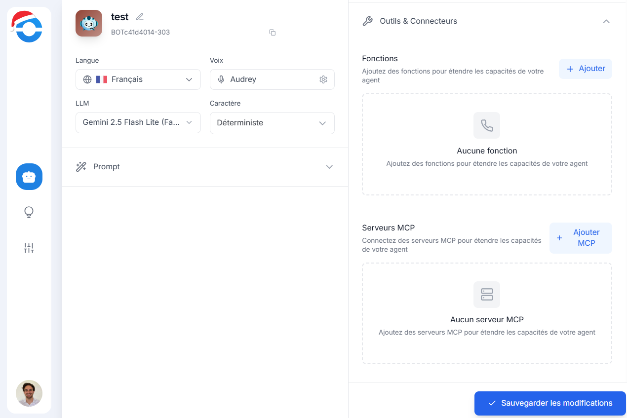 Sans fonction configurée, l’agent reste limité à la discussion et à l’information.