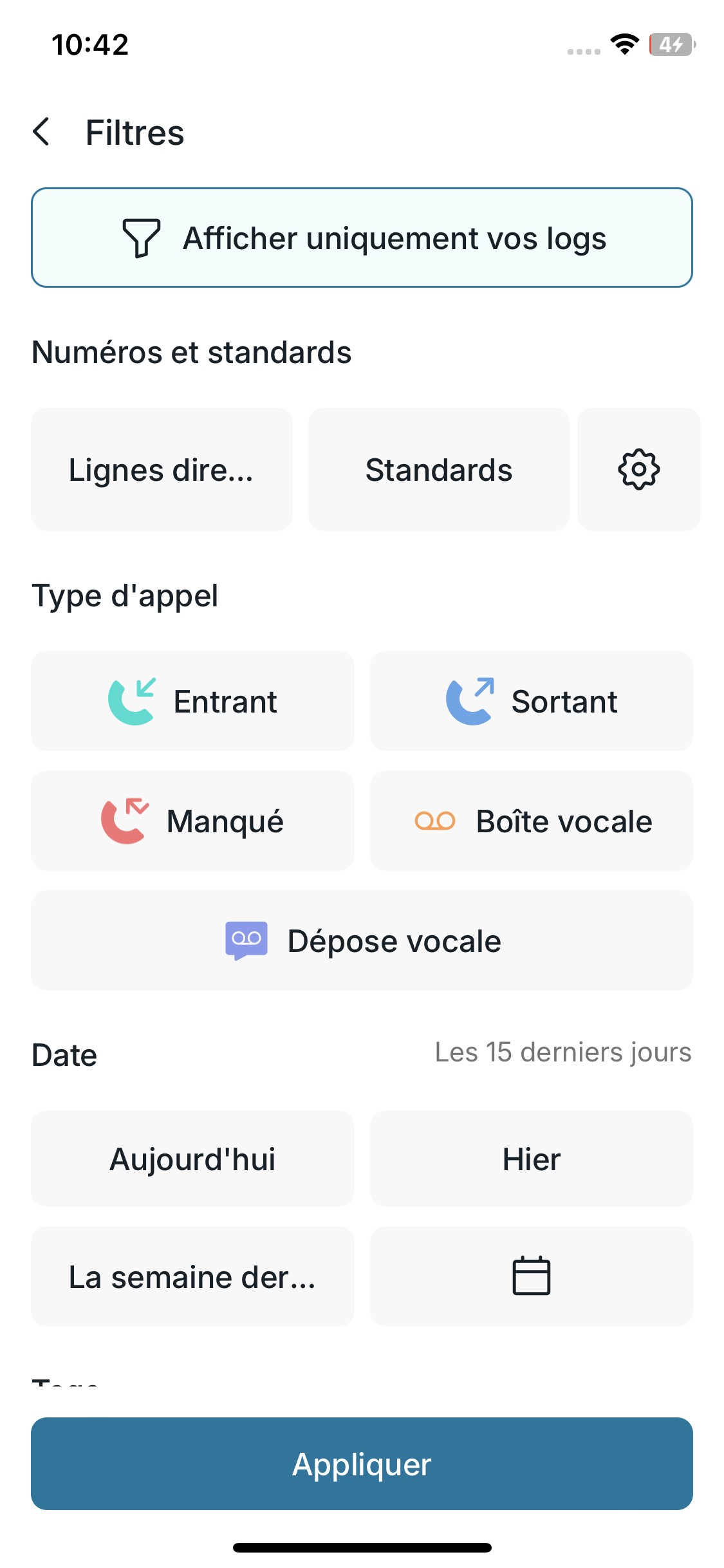 Vous souhaitez retrouver tous les appels liés à un tag « Support ». Sélectionnez le tag correspondant pour afficher uniquement ces communications.