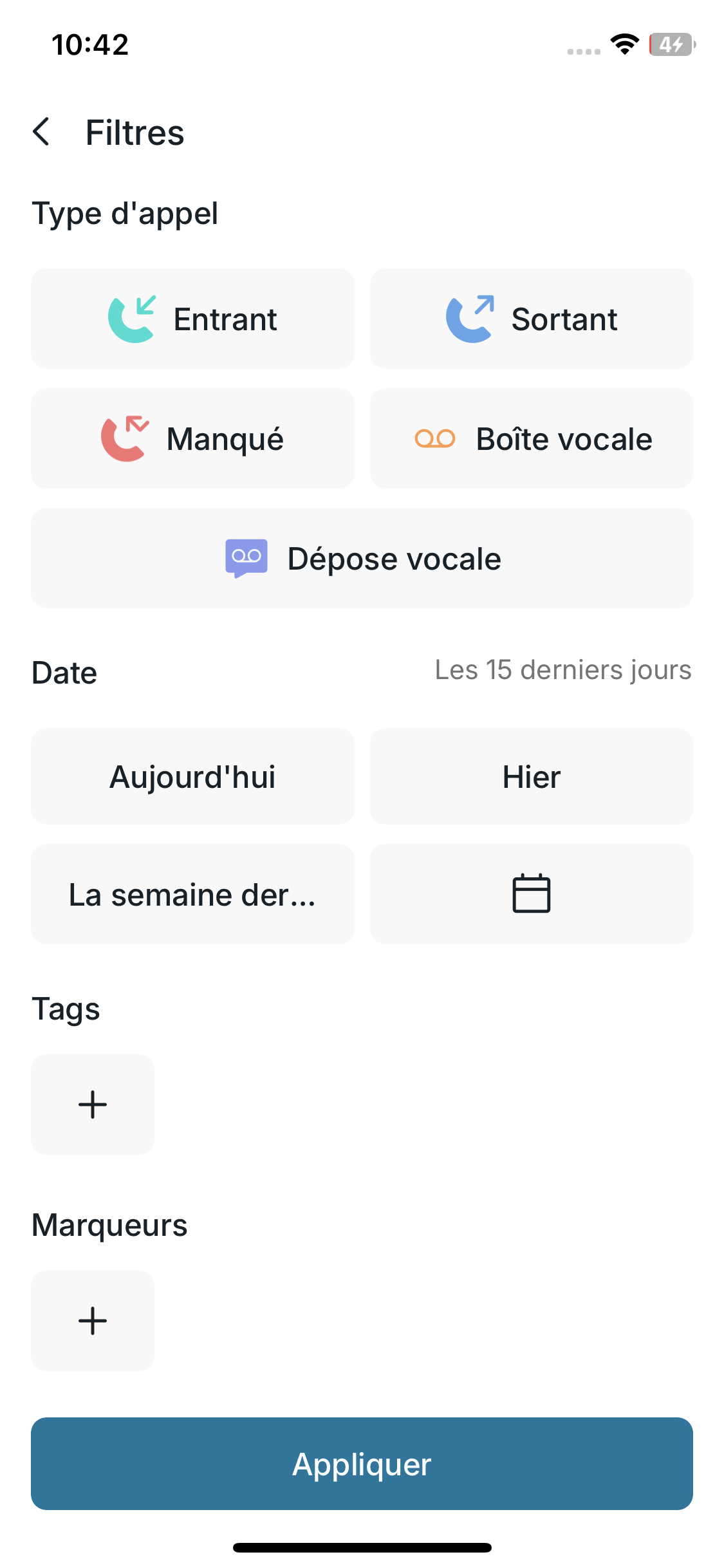 Marqueurs : affichez uniquement les appels contenant des marqueurs.