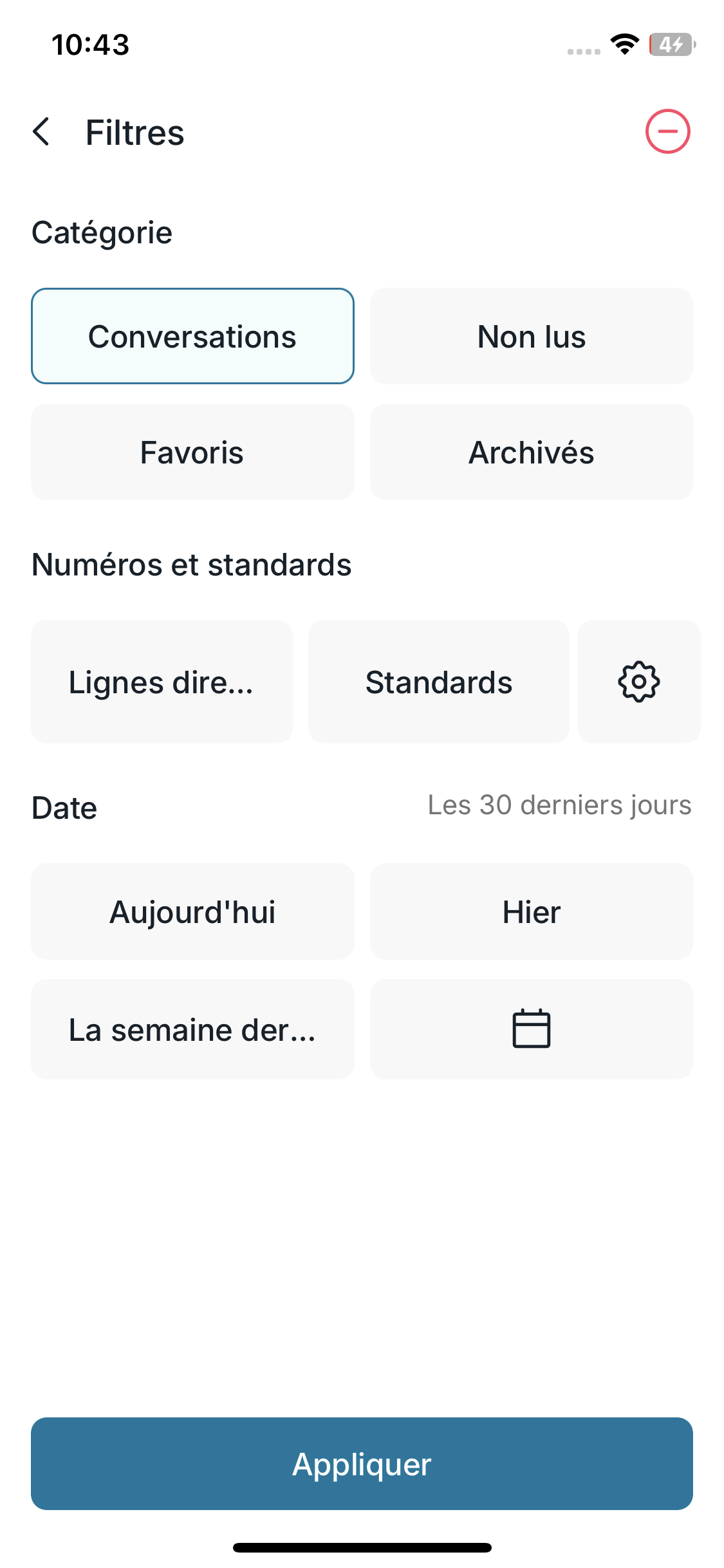 Dans la section Messages, les filtres vous aident à organiser et prioriser vos conversations écrites.