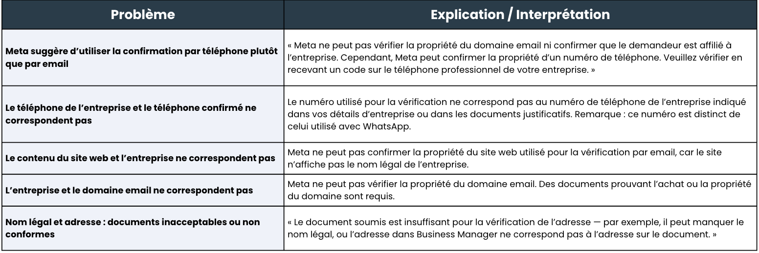Voici quelques problèmes courants rencontrés par les utilisateurs lors de la vérification Meta Business pour WhatsApp :