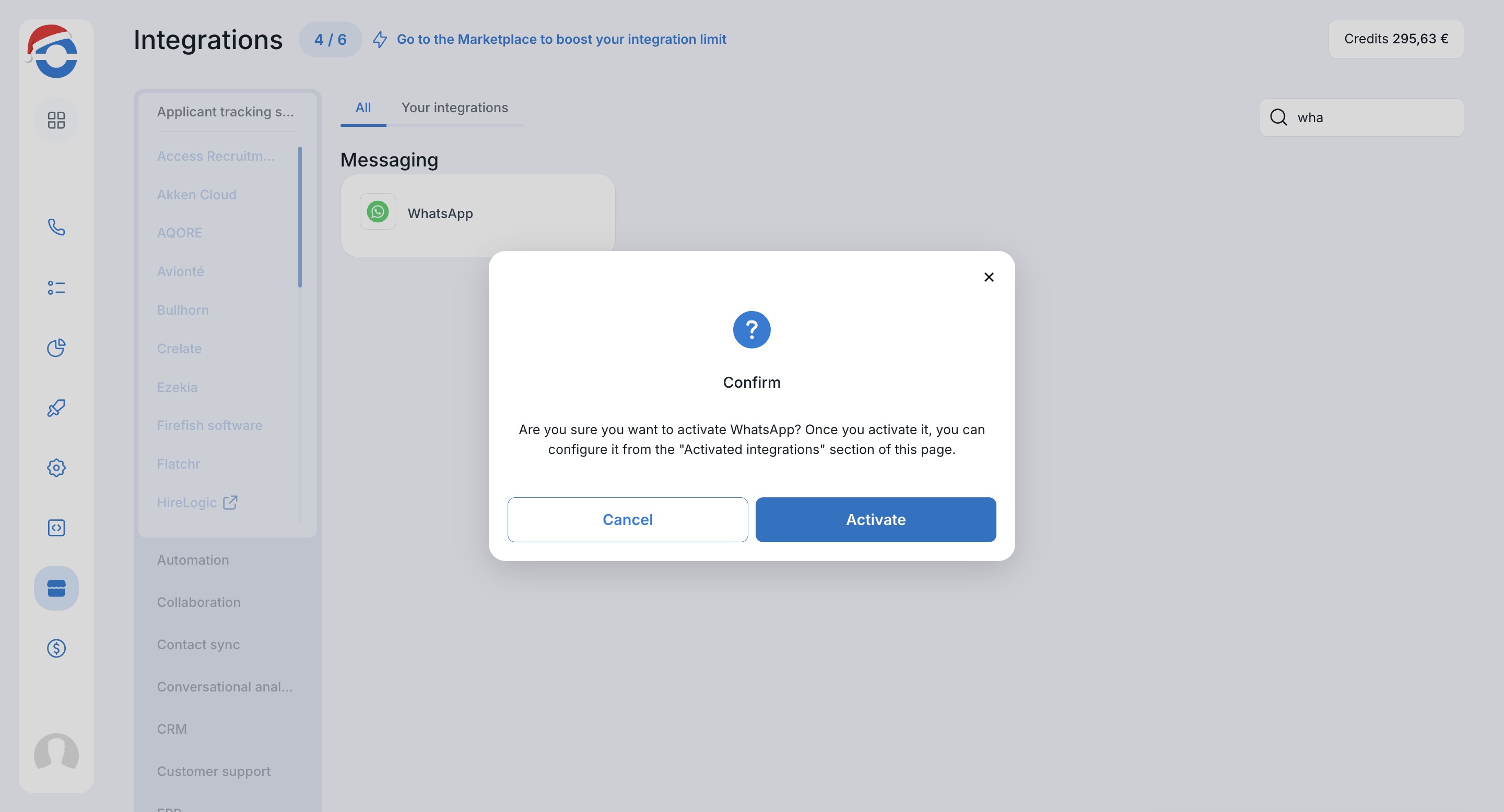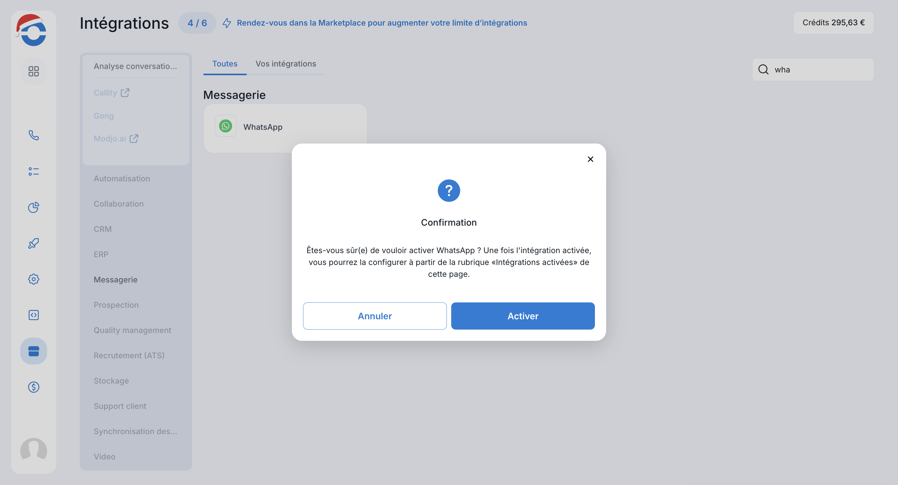 Accédez à « Intégrations » dans la section Marketplace de votre menu tableau de bord, appuyez sur « WhatsApp » puis sur « Activer ».