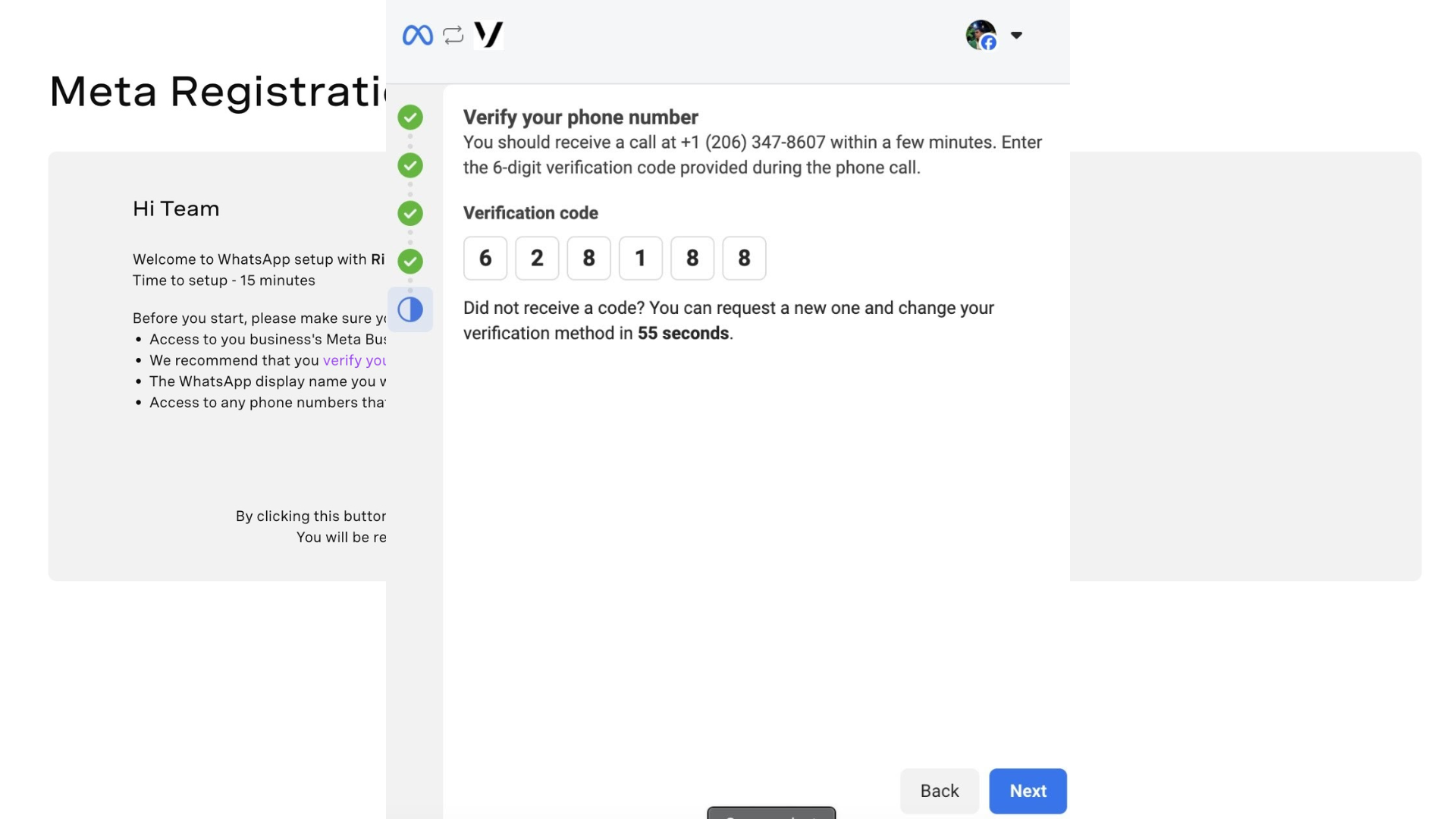 - Assurez-vous que vous-même ou un membre de votre équipe êtes disponibles pour répondre à l’appel et noter le code de vérification. Lorsque l’appel arrive, répondez et notez le code de vérification fourni par Meta.