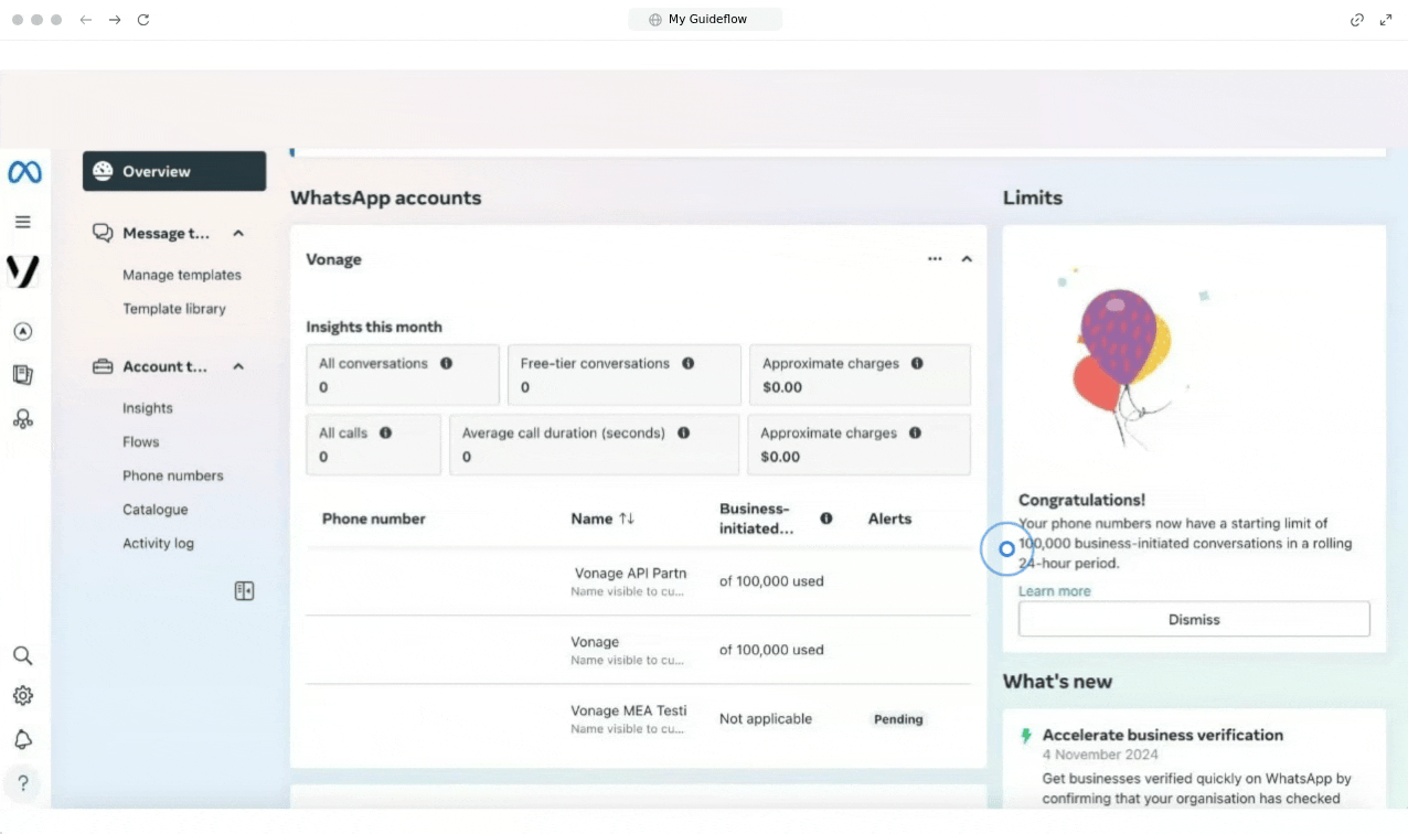 Bien que vous puissiez commencer à envoyer des messages immédiatement avec certaines limitations, il est fortement recommandé de vérifier votre entreprise auprès de Meta afin de débloquer tout le potentiel de votre compte.