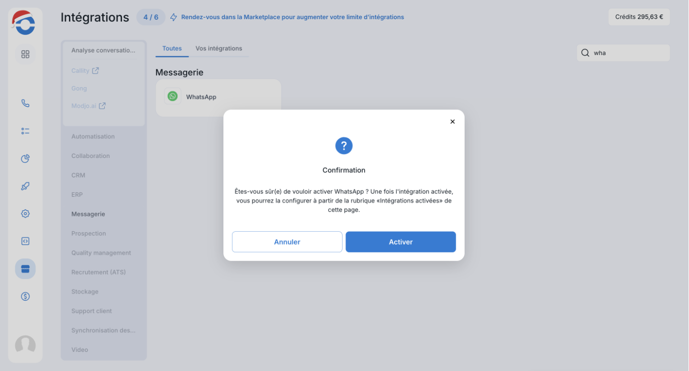 Accédez à « Intégrations » dans la section Marketplace de votre menu tableau de bord, appuyez sur « WhatsApp » puis sur « Activer ».